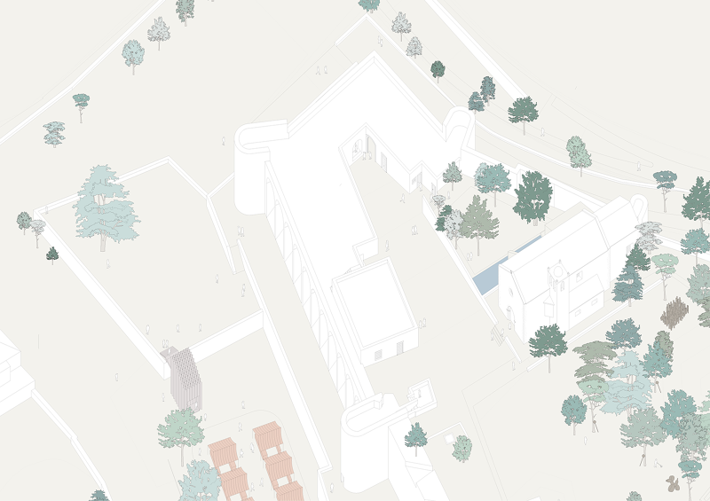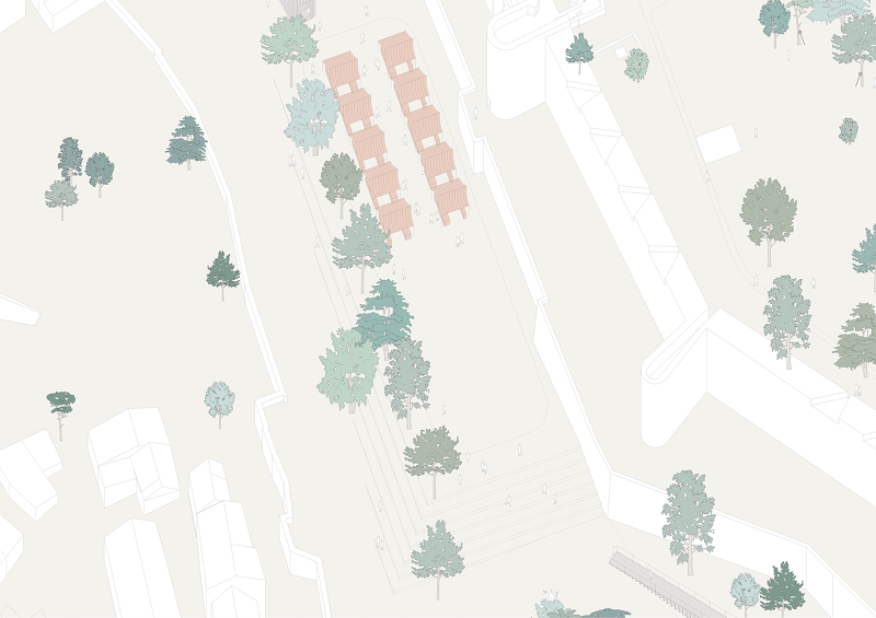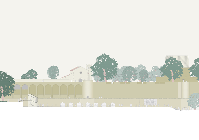 Between Sta. Maria’s Church and the Governors Palace, the Church Garden is walled with water tanks and vegetation, benches and tables for reading and meeting. The wall will strengthen the relationship between the entrance ramp, the Church, and the Woods.