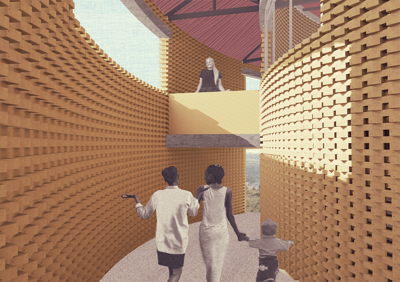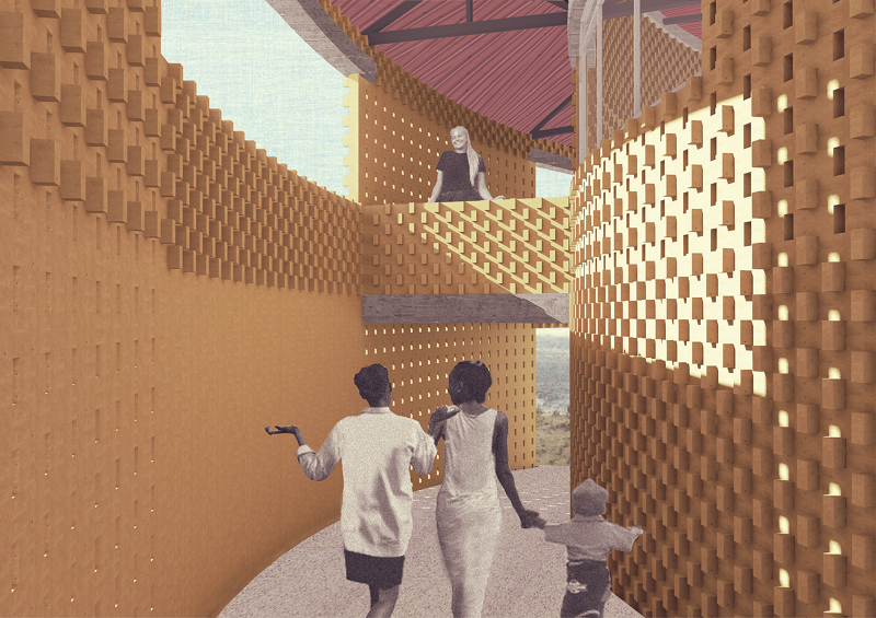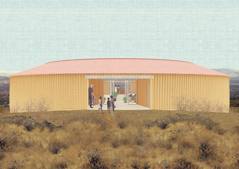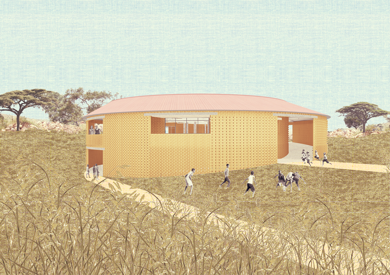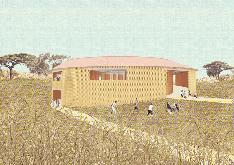 Our proposal for the Katempris Dining Hall is placed on the Southwest corner of the site and benefits from an expansive view over the nearby valley. The terrain is steep and defines how the building is organised: the Dining Hall is at the upper level, allowing for the maximum views, while at the lower level there is a water tank, storage and other services making use of the available height. The main concept is that of maximum accessibility: the Dining Hall can be entered at three levels and all entrances give access to a circulation gallery which surrounds the building.