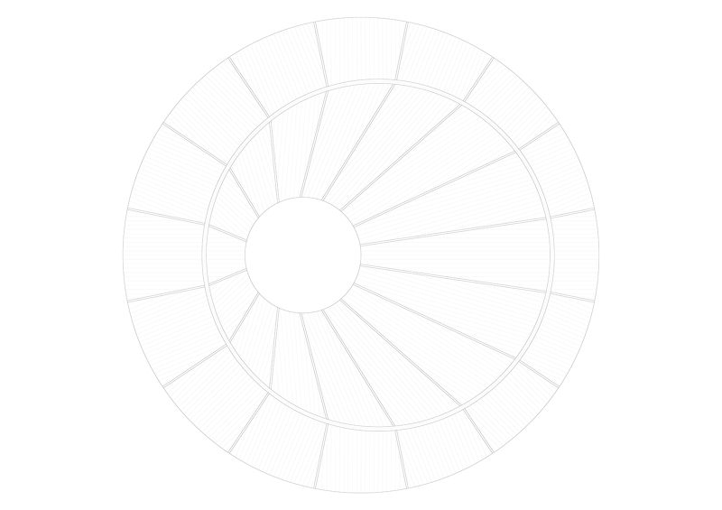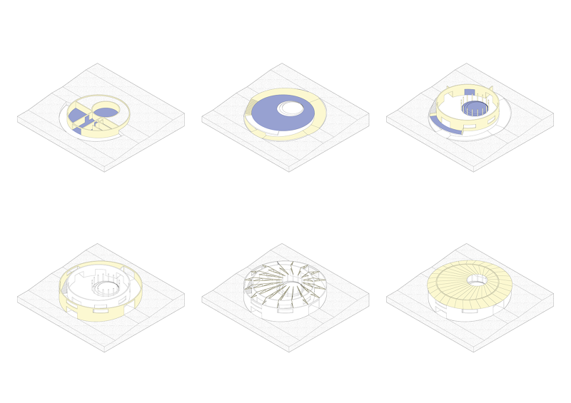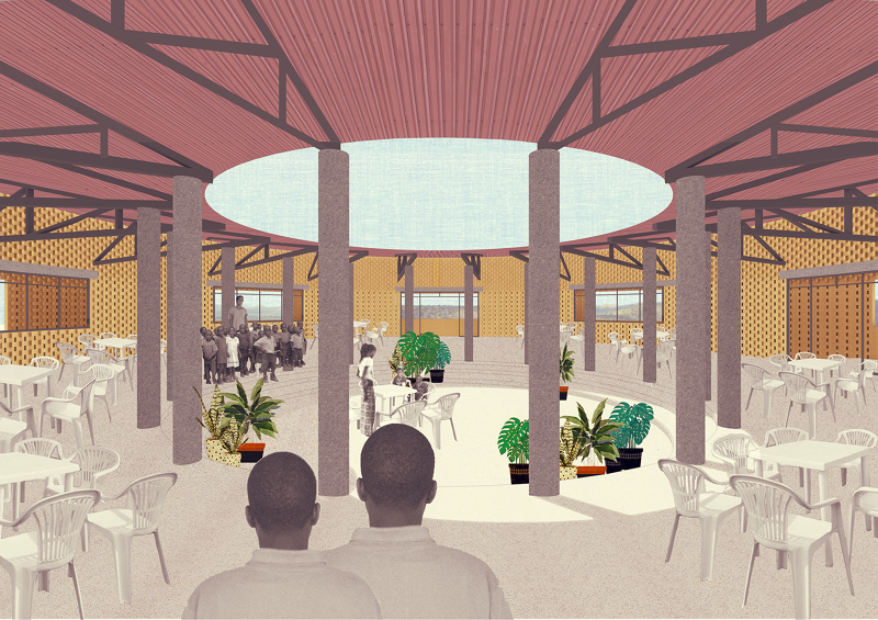 We have developed a proposal which is distinct while constructively simple. The building is structurally clear and organised in three eccentric rings: the inner water tank wall, which supports the first floor slab and the courtyard columns (onto which the inner roof beams rest); the middle dining hall wall, which supports the first floor slab and becomes the roof ridge; and the external wall which supports the ramp and stairs as well as the roof outer beams. Variying lengths wood beams span between the outer and the middle wall, and from the middle wall to the courtyard columns to create the eccentric roof. The pitch roof runs towards the inner courtyard and the outer perimeter of the building and is clad in corrugated steel.