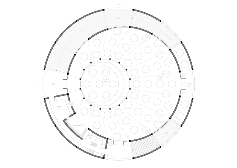 The First Floor is organised around a central courtyard, which provides natural light and can be used as outside dining area or a stage for various events (three concentric steps allow for informal seating). The Dining Hall allows for multiple configurations and has a capacity of up to 360 seated guests. The surrounding circular brick wall is perforated, naturally ventilating the space and letting in glimpses of light. This wall has 8 openings: two are access doors (the main entrance and the stair to the level below); four are windows (which open through the gallery space and offer views of the outside); one doorway opens into the food serving area and one into a veranda (this area allows for outside seating, a view of the gallery below and of the landscape beyond). The Kitchen has a cleaning and a cooking space divided by the food serving area. There is easy delivery access to the kitchen from the road as well as a direct stair to the ground level additional storage.