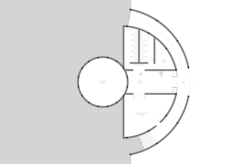 The Ground Floor occupies half of the building’s perimeter, using the space which is gained by the terrain’s slope while keeping most spaces naturally lit. A central spacious Atrium gives access to the restrooms and storage to the North and to a multi-functional room to the South (which can complement the kitchen storage or be used for other activities). At this level there is the Water Storage Tank, the core of the building, which collects rainwater from the roof and courtyard.