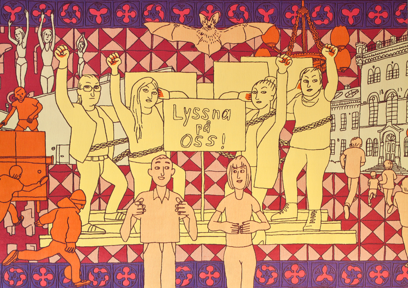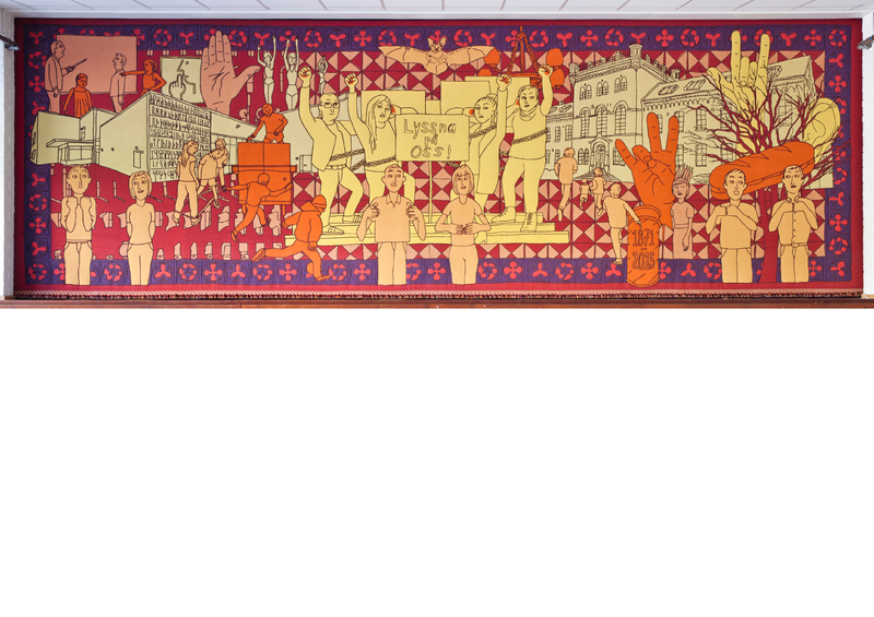 SUPERFLEX was invited to make a new artwork celebrating the union of the two schools between deaf and hearing cultures. Through workshops and interviews with children from both schools, stories about the transition were revealed and pieced together in a large wall tapestry. The central motif of the tapestry shows four deaf students, fists raised in the air, protesting. Their protest banner reads Lyssna på oss, which translates as Listen to us.