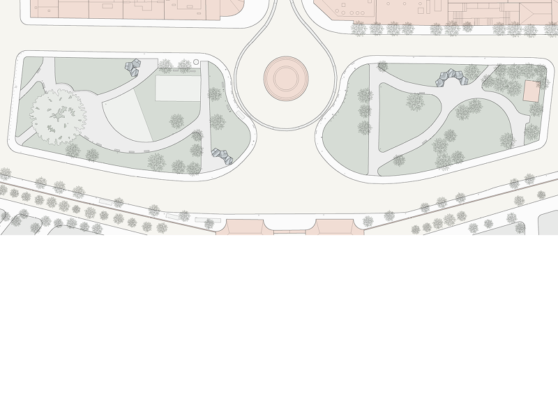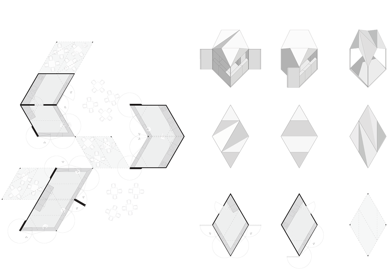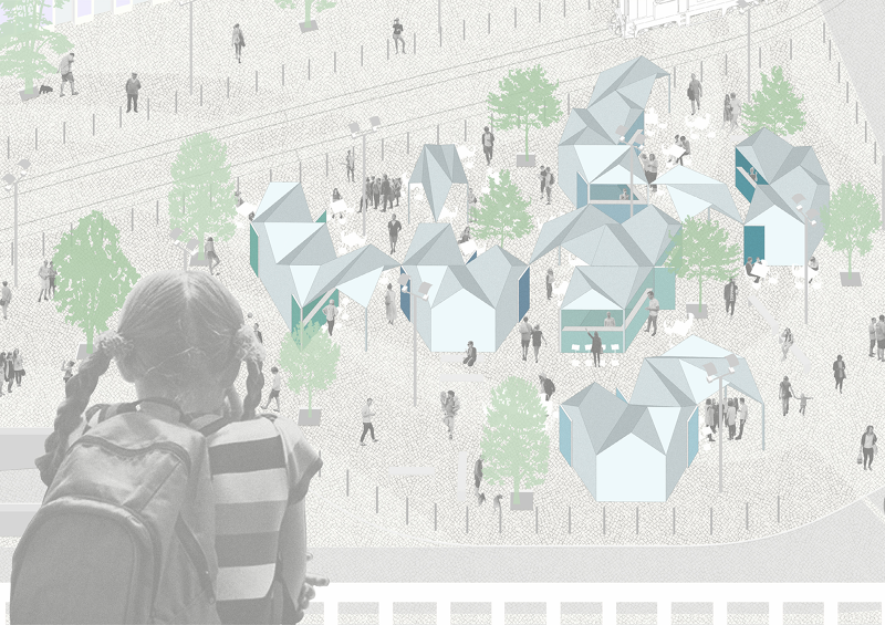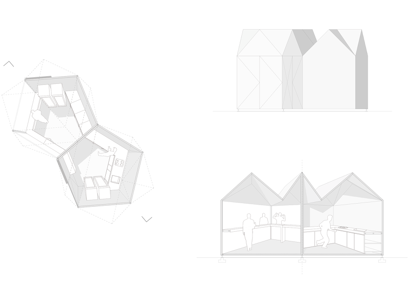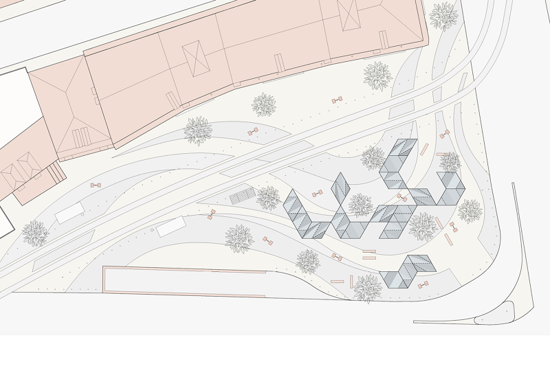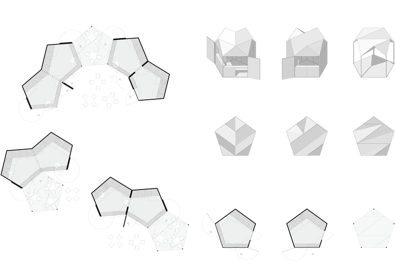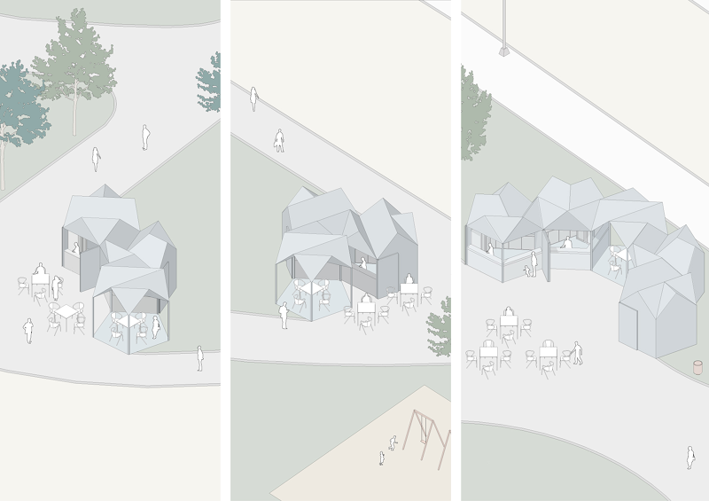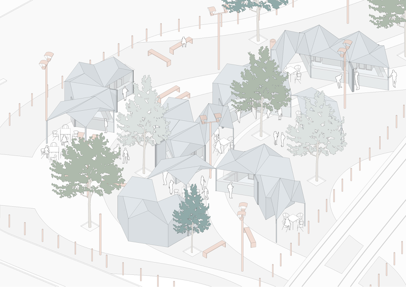 The module’s roofs vary in their design - seeking a formal connection to traditional kiosks, while generating a unique, origami-like language of folding planes in space. The system of these pavilions was based on two pure geometric shapes – a Pentagon and a Diamond. Though they might appear to be unusual in their surroundings, these geometries result from a study into a grid that could guide potential configurations, while at the same time allowing for adjustments to the particularities of any chosen site. The compositions establish a guiding logic, while keeping a homogenous formal identity.
