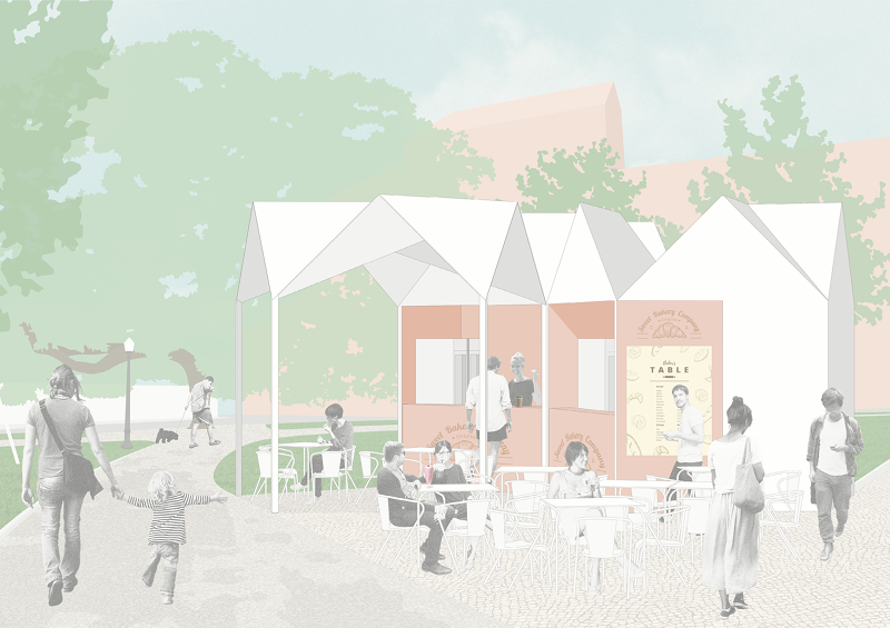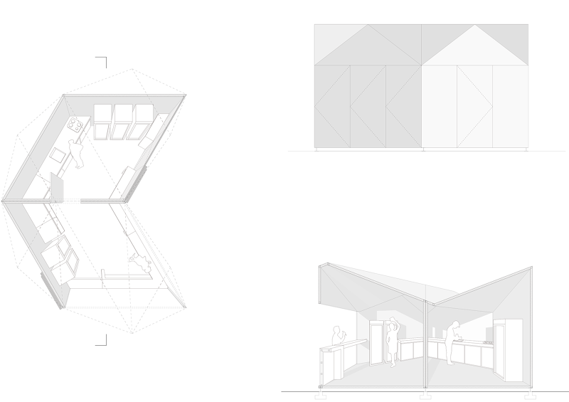 Each module can be set up to have direct communication with an adjacent module, either by removing a door or an entire panel, depending on the intended use. While the pavilions are similar in plan, they differ in their canopies. These correspond to three distinct functions – bar, kitchen, and shading support – allowing them to be easily recognisable from the surrounding public spaces. These typologies can be combined in different manners to house a variety of services.