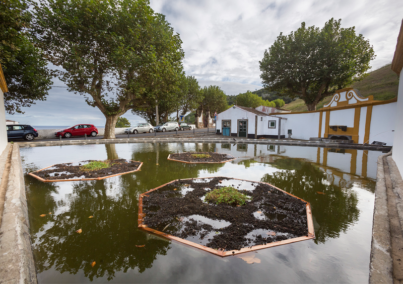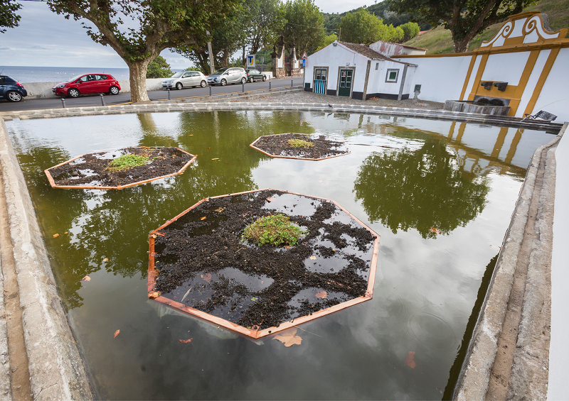 The intervention consists in the displacement of a four-leaf water clover into the public space. Formerly described as Marsilea azorica, a scientific article in 2011 demonstrated that the flora - once thought to be a protected species that could only be found in a small pond in Ilha Terceira - was actually Marsilea hirsuta, a plant from Australia popular in aquascaping. Overnight, the endangered four-leaf water clover became an invasive species within the Azores.