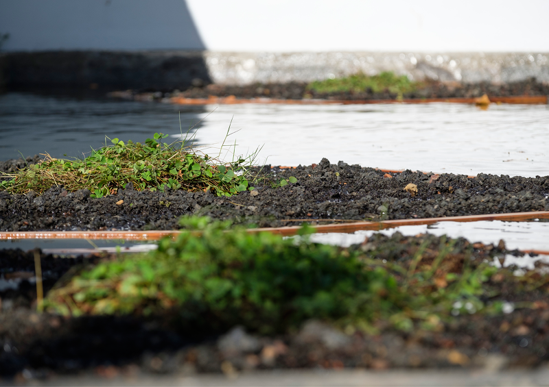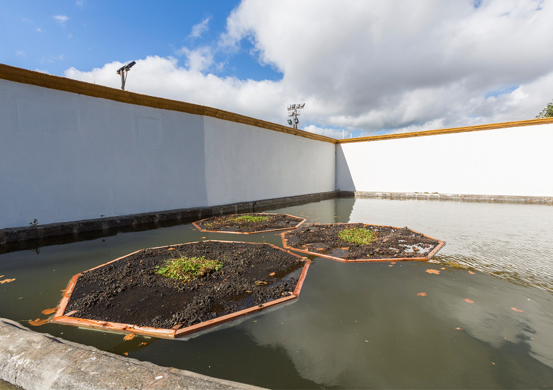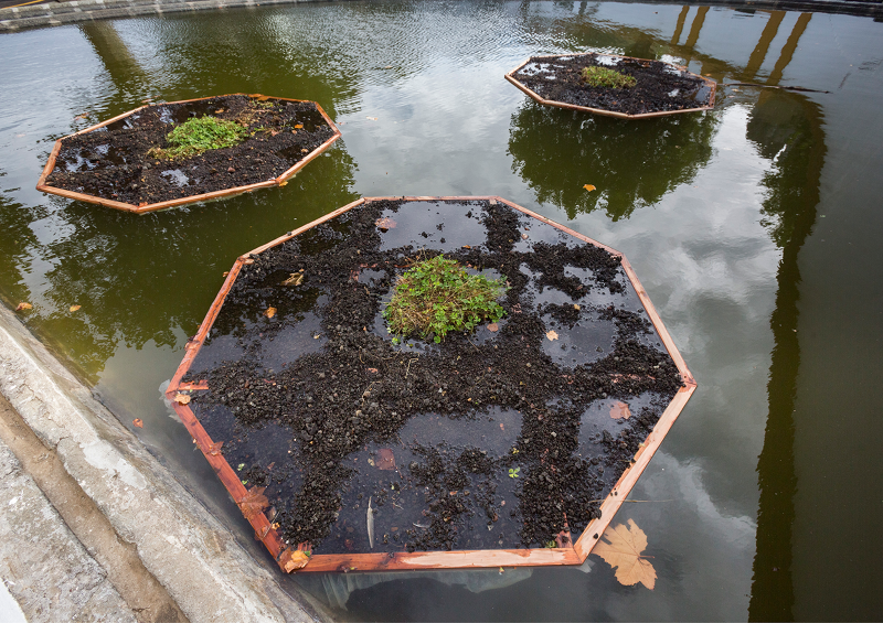 The clover was carefully collected and transplanted onto three octagonal rafts which are lined with local lapilli, a volcanic material, as a substrate for the plants’ growth. The octagons float in a 17th-century quarter-circle tank, drifting with the breezes in a slow, never-repeating movement.
