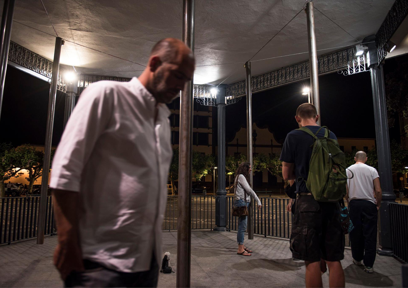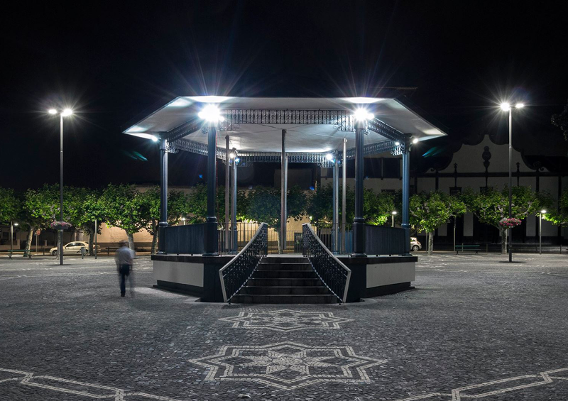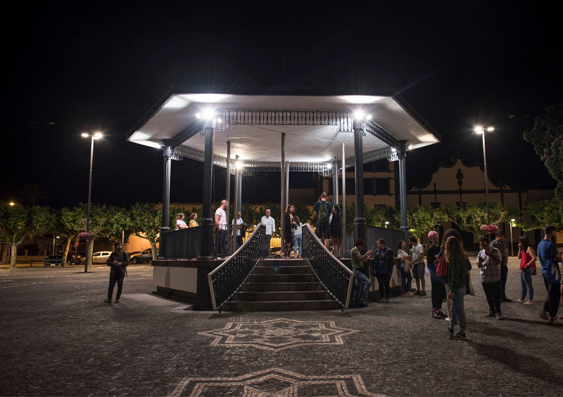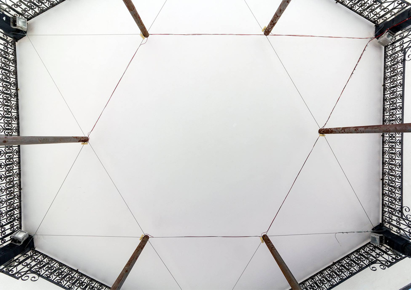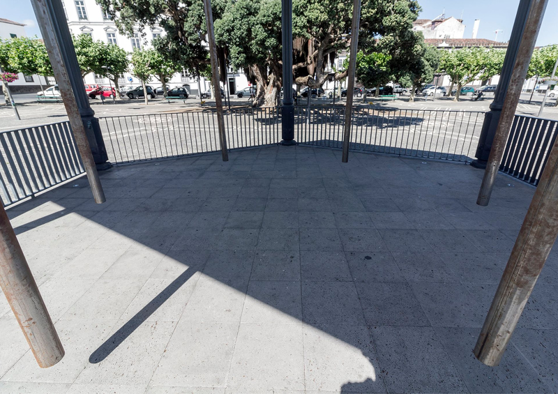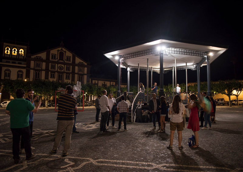 Jacinto was invited to propose a work on the bandstand of Praça de São Francisco in Ponta Delgada. Despite the Azores having a large number of philharmonic bands, the bandstand is mostly used during religious festivities and the square is otherwise left deserted most of the year. Jacinto’s work is an installation, Medusa (reflexo), a nomadic instrumental and installation device designed to support a solo cello performance which incorporates specific sonic and architectural characteristics of the place where it is installed and performed.