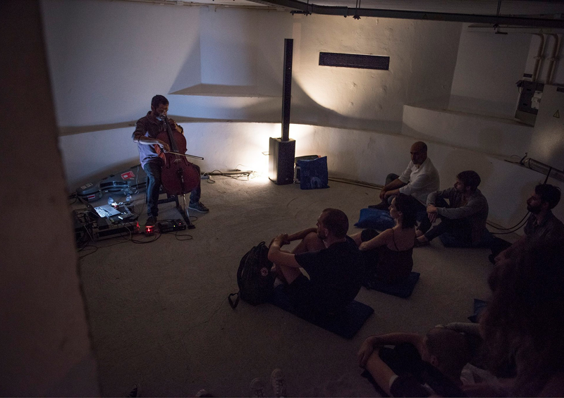 Addressing questions of site-specificity both in the installation setup, and the musical performance, this electroacoustic system aims for a “sonic transfiguration” of the cello´s body when in contact with the place hosting its performance. For the sound installation – which remains as an echo of the performance – a steel tube structure is installed within the bandstand. Contact speakers are mounted to the tubes, making them resonate with sounds recorded during the performance. By amplifying the footprint of its space, the bandstand becomes simultaneously an architecture of sound and also a music box, a standalone, urban musical instrument.