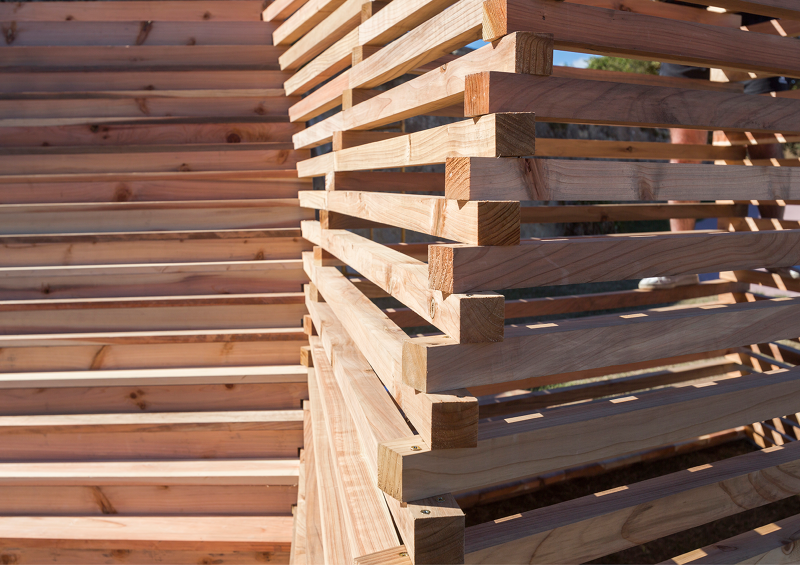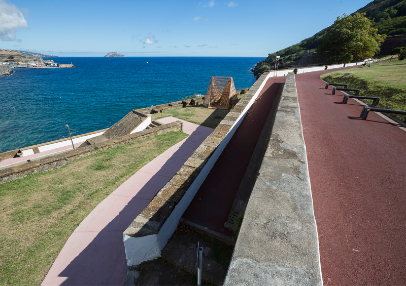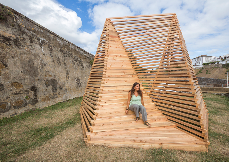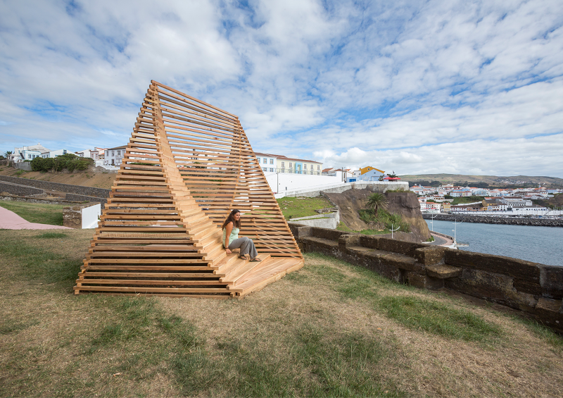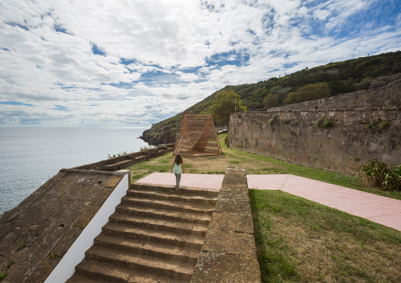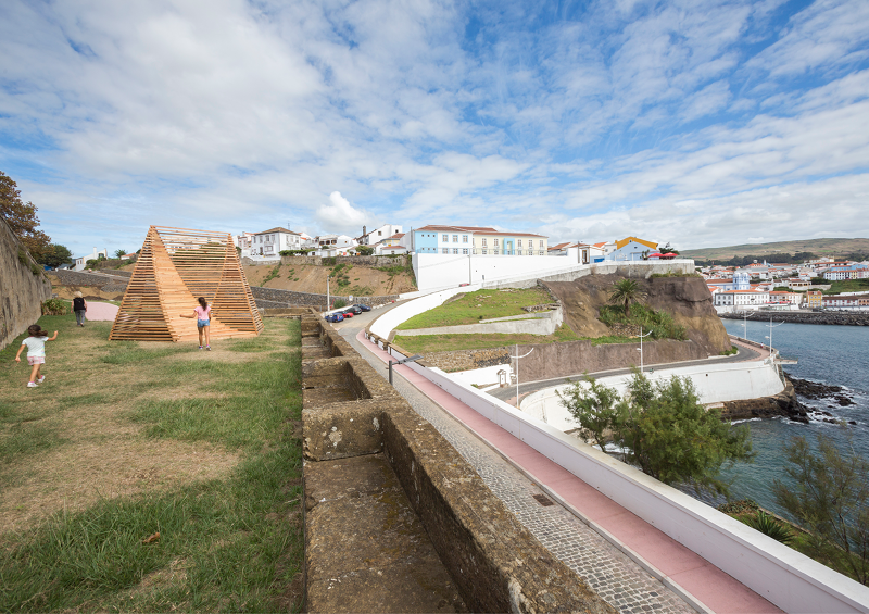 Mira is part of a continuing research emphasis which started with Sømaerke (Aarhus, Denmark 2015 and Cottesloe, Australia 2016): structures built of simply stacked wood along the coastline that serves as both a marking point while generating identity of a new space. Carefully located on a terrace between two fortified walls, it overlooks Angra’s bay, allowing a distinct view of both the city and the sea while being seen from afar, drawing visitors to an unnoticed fringe of the urban park.
