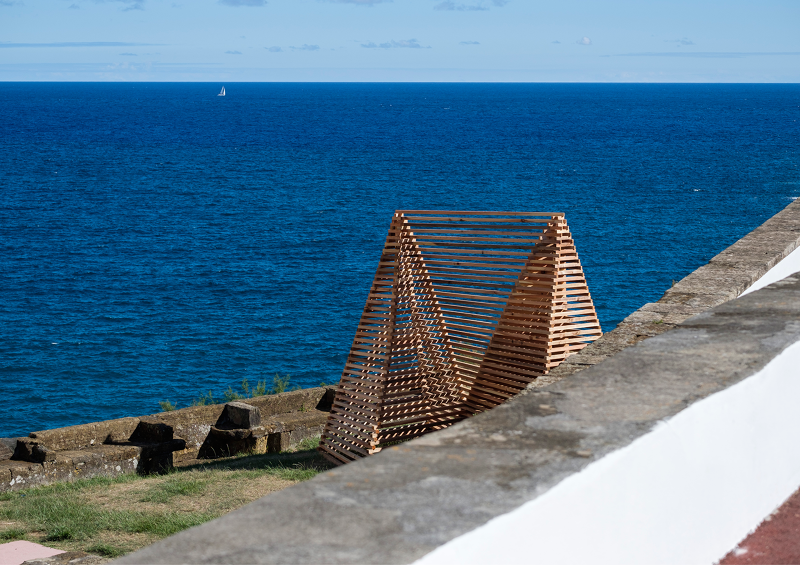 In the Azores, the structure takes the shape of a ‘burra de milho’, a traditional maize crib used to dry and store corn that once commonly punctuated the landscape but is now rarely found. Pyramidal in shape and with a hexagonal base, these structures were built of six pine beams and thin slats where the cobs would hang from to dry.