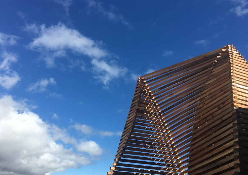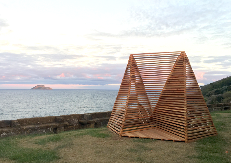 Mira mirrors the silhouette of a granary but is slightly more complex in shape – a heptahedron where the apex rotates towards the base defining a hyperbolic paraboloid surface and dividing the pyramid in two sides: one faces land and is a shelter, providing protection to a stage or as a place to gather; the other is a small amphitheatre facing the sea with unimpeded view of the ocean. The pavilion is open and will be defined by people’s momentary decisions of its use.