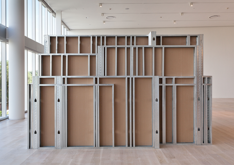 The decision to leave one side of every wall unfinished intimates an interior and exterior, a gesture that works to blur individual purpose and, instead, emphasizes each wall’s contribution to the larger piece. To me, this represents the “interiority” of the piece where all of these spaces, a dreamlike condensation of year after year of work, an entire career, is hypostasized in a single convoluted structure. The overlapping and crossing of the walls in the real, physical space of the gallery echoes the confusion of design-based computer software as it struggles to render multiple objects in the same location. The work has no distinctive fealty to what should be read justifiably as external and internal. This attempt to “render” the significance of each wall by the observer is required; it should be a process that is immediately approachable, yet demands deeper interest upon further investigation. The sixteen studio spaces combine to form a piece with presence and weight that is greater than the gestalt apprehension of its form.