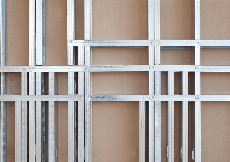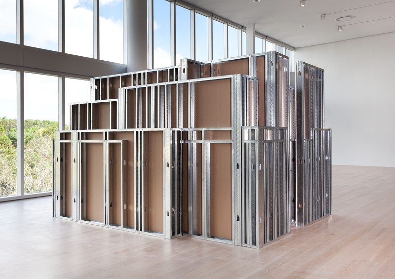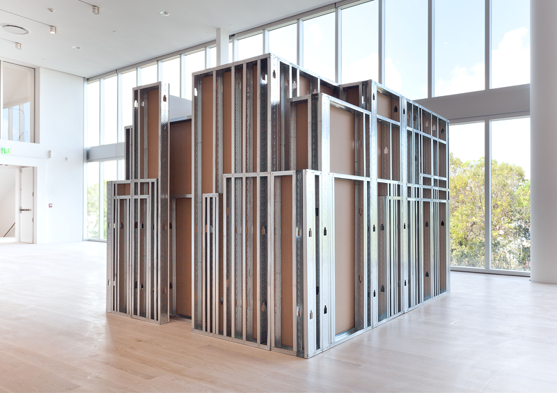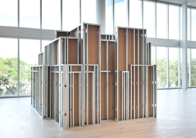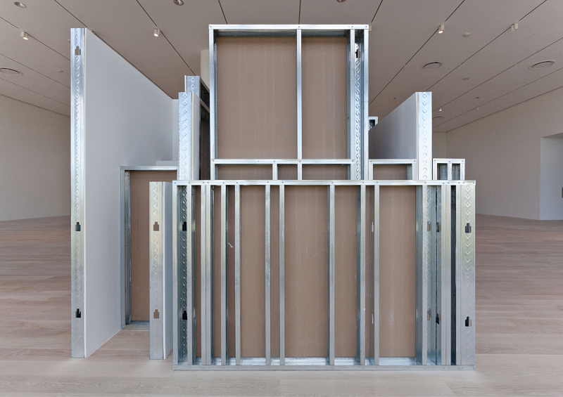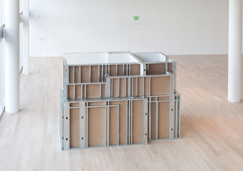 Margaret Honda’s Model for ‘Sculpture’ (2017) seems to just jam a lot of walls together. It’s big—taller than I am—and seems to have almost a linear mile of metal construction studs holding everything up. Honda told me about Model for ‘Sculpture’ only after she had received the initial CAD files from Ricardo Gomes of KWY.studio, an architecture office that recently worked on the Tate’s Turbine Hall project with SUPERFLEX. I saw from the file that the work itself is the convergence of sixteen studio spaces, all used by Honda at various points in the past, compressed into a single twelve-by-nine-foot footprint. The established parameters of the project were simple: everything needed to fit, and no architectural information from each individual studio could be left out. The sixteen simplified volumes, which were constructed from metal studs and drywall at one-half scale, combined to become a dense collection of spatial boundaries—walls covering up walls, posts blocking other posts. There is an excess of infrastructure and a dearth of volumetric space. The effect compresses space rather than delineating it. Dense orthogonal crossings and overlapping studs become a metastasizing force, resulting in redundancy and insensibility, as if earlier studios proliferate into later ones. The exposed, unfinished side and the finished drywall side of each wall run up against one another. When two walls overlap, the vertical-horizontal stud structure is maintained. Simultaneously, when two walls cross, the interior crease is finished and the two walls are merged at the corner.