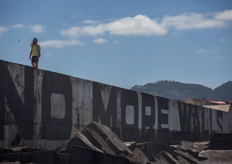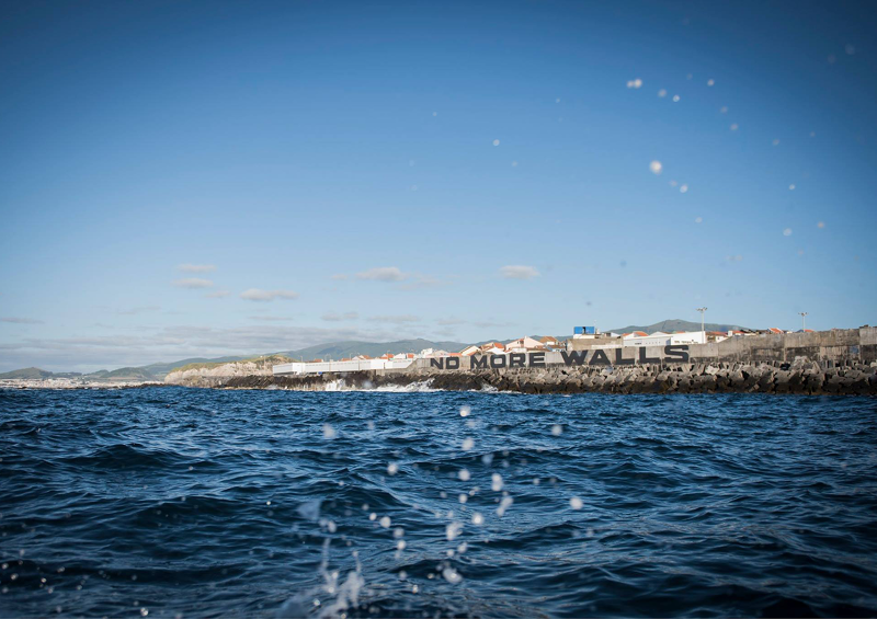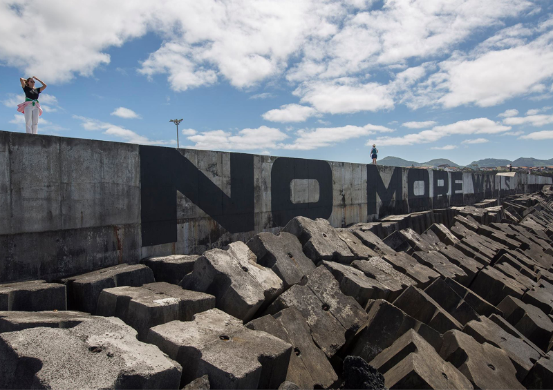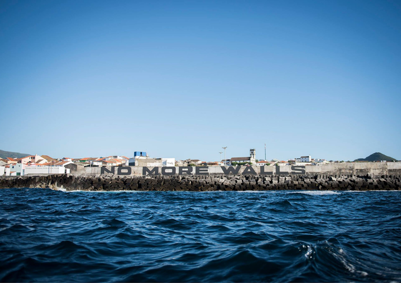 The sentence “No More Walls” is drawn in large dimension on the surface of a wall at a particular location of São Miguel. The sentence proposes different readings inviting us to reflect in the context of urban art, where the managing of walls in urban areas serves the purpose of beautifying gentrification actions and urban disarray. Social, cultural and geographic frames where there are still imposed limits in the form of psychological and physical barriers.