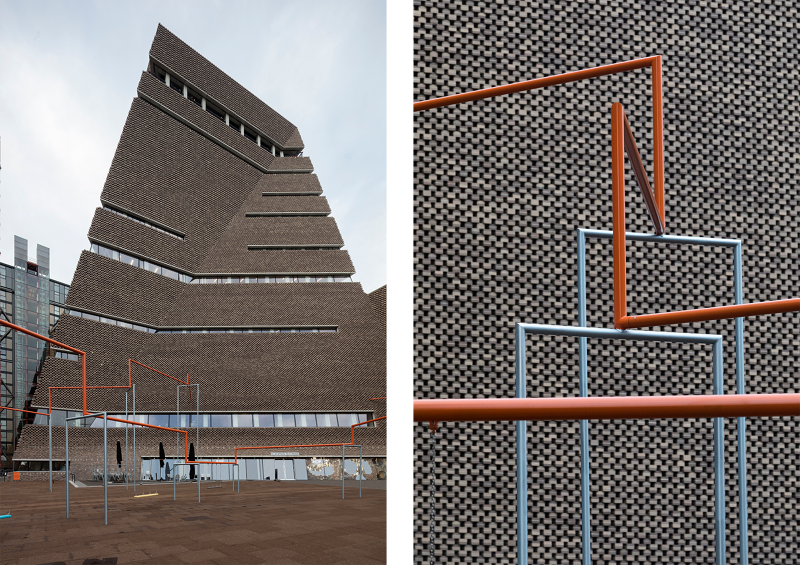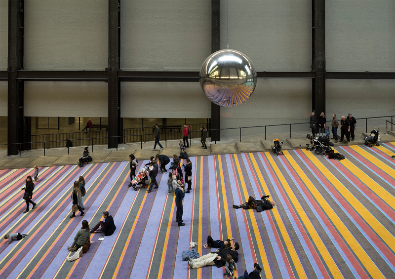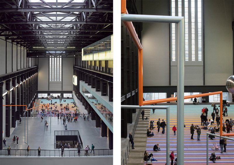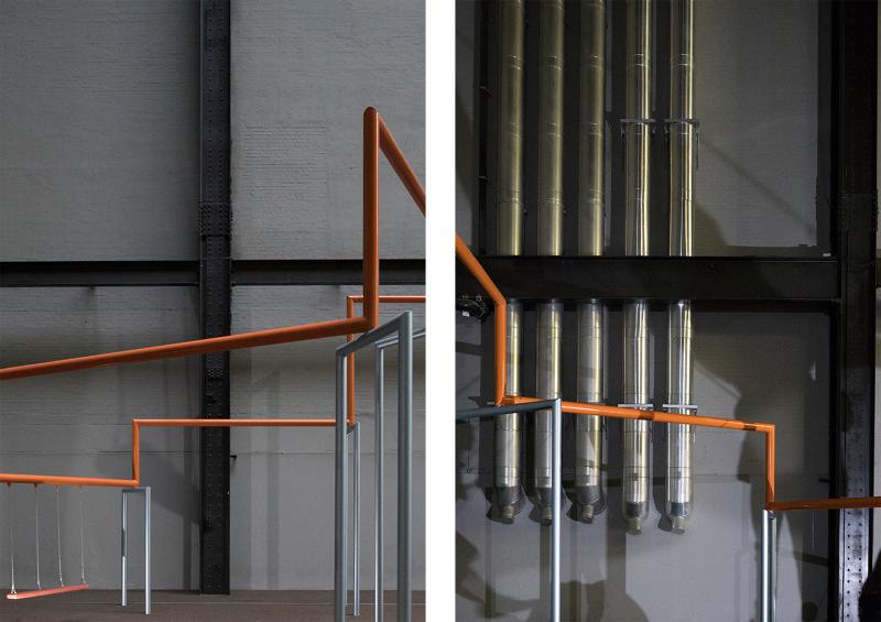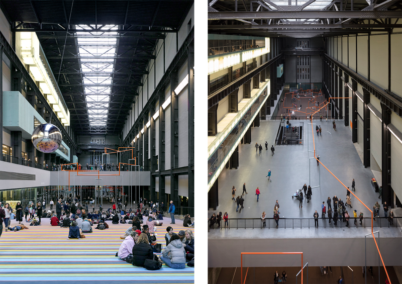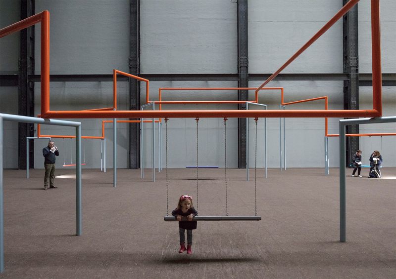 One Two Three Swing! is a solo exhibition at Tate Modern’s Turbine Hall and the first Turbine Hall commission to extend beyond the gallery walls. An orange line connecting dozens of three-seated swings weaves through the Turbine Hall, emerging onto the terrace outside Tate Modern where it will activate the space throughout the day and night and continue to extend over time.