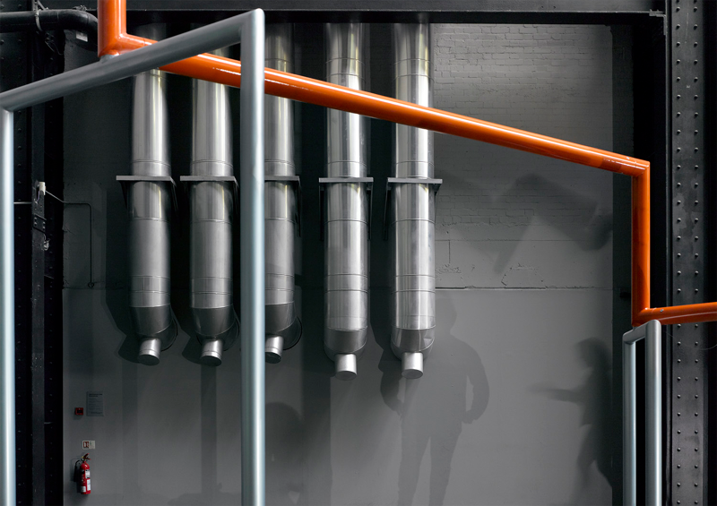 One Two Three Swing! challenges society’s apathy towards the political, environmental and economic crises of our age. The installation is experienced in three states: apathy, production and movement. The state of apathy compromises a large pendulum suspended by a 20 metre cable from ceiling and swinging above a 770 square metre carpet in a colour scheme inspired by British currency. Occupying the far end of the hall is the state of production, a factory station where swing seats are assembled, stamped and stored prior to distribution and use. Emerging from the state of production, an orange line formed of sets of interconnected, three-seated swings invite and frame the movements of users.