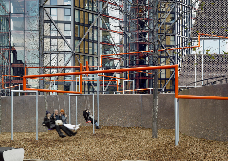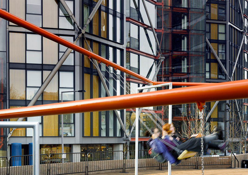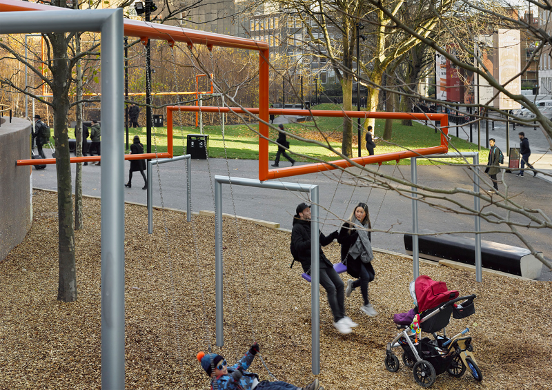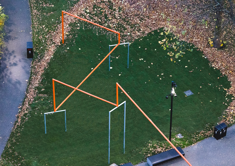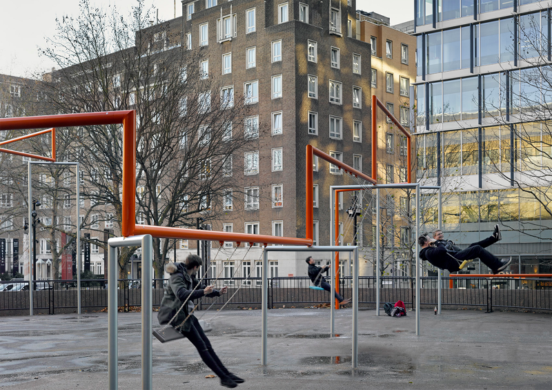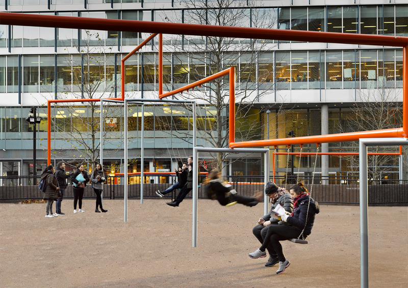 The act of resting in contemplation with the hypnotic pendulum above is set in contrast to the liberating, collaborative experience of swinging together. Over time the work will evolve as the orange line continues to grow and new swings are added into the wider world.