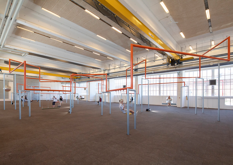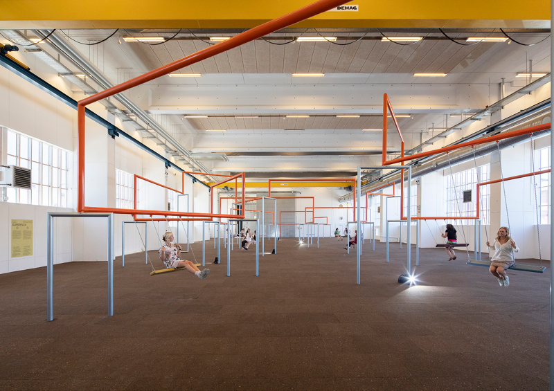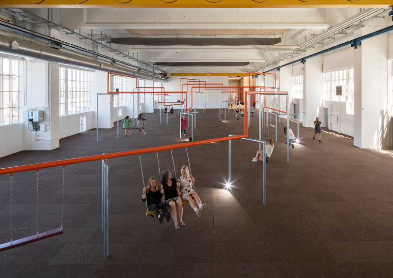 An orange line of swings weaves through SUPERFLEX’ large-scale installation One Two Three Swing! Where swings are normally made for individual use, SUPERFLEX’ swings are designed for three people to swing together and experience the potential of collaborative participation.