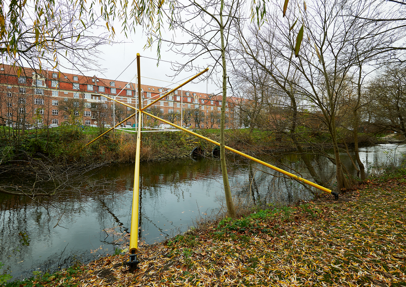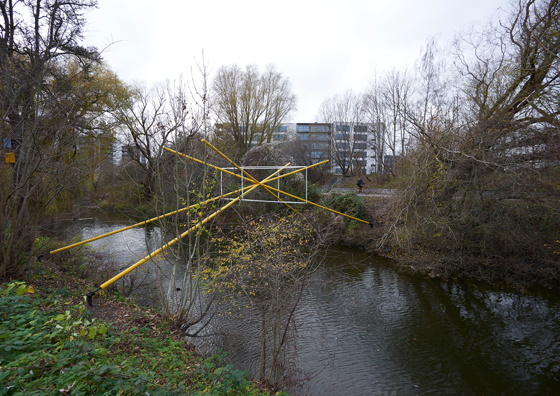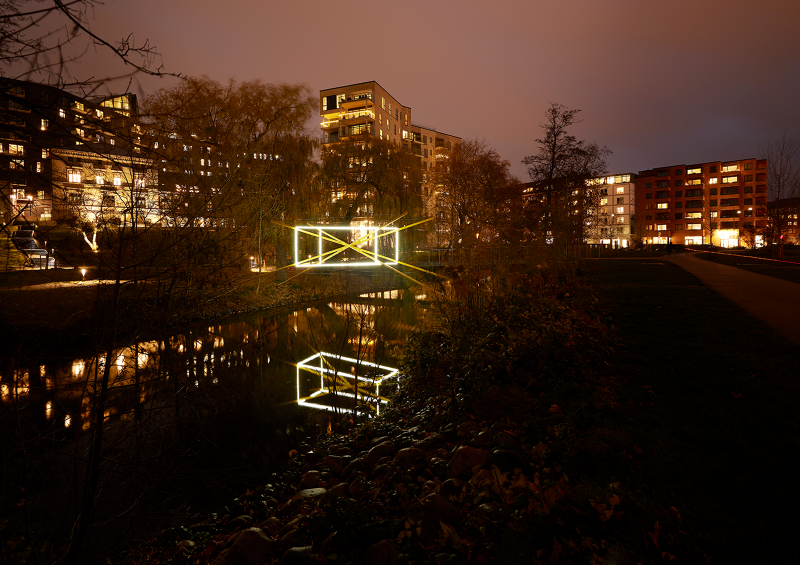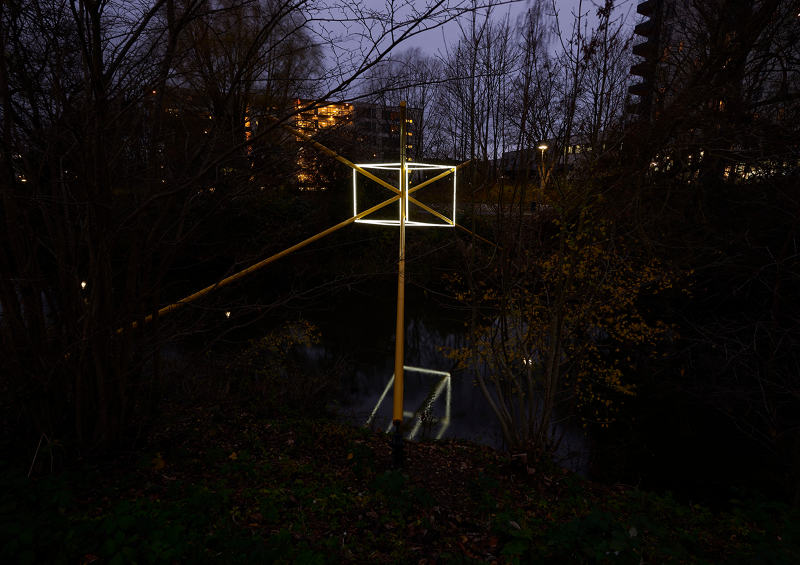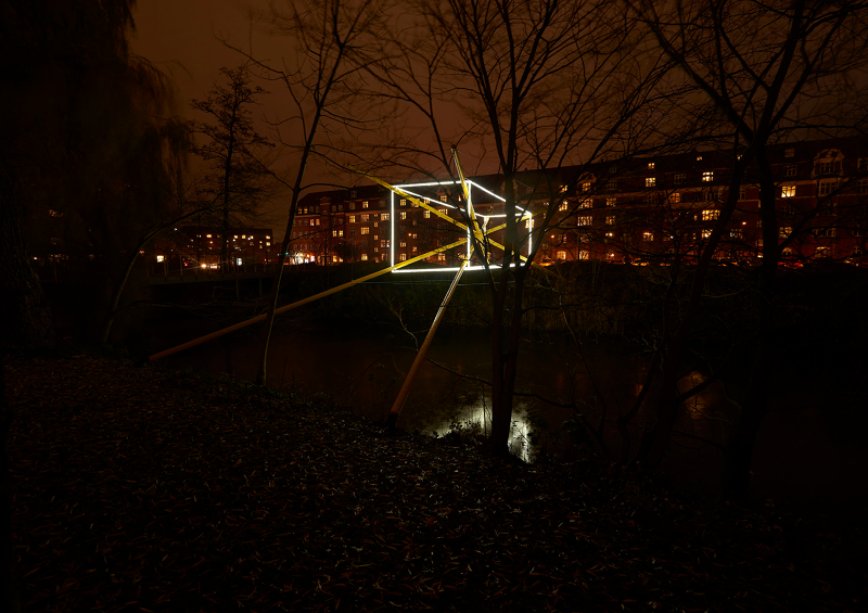 Each sculpture consists of four steel beams painted in yellow, jutting up and above the river banks, converging and crossing, becoming structural axis in space. These beams are caught in perfect equilibrium with slender wires, thin lines of stainless steel, that form a crisp stretched cube around the beams. Together these two elements make a structure that spans the river, arching up over the water. Within the cuboid of steel lines is the light form, echoing it, but twisted slightly off the perpendicular axis, supported at each corner by the four steel beams. The visual balance between structure and light shifts as darkness draws in, and the light from the sky fades, the lines of light that become ever more prevalent, the beams and supporting structure of the sculpture now less visible as the bright dance of light begins.