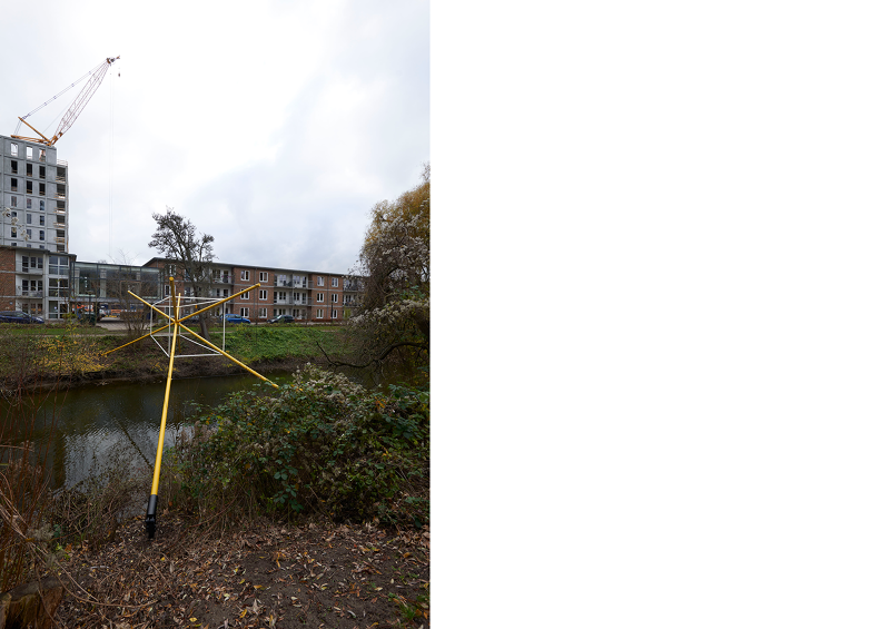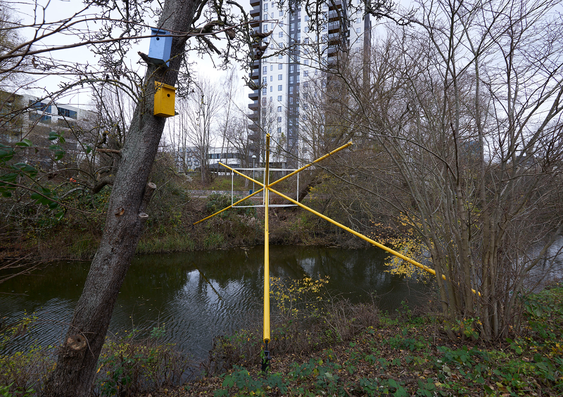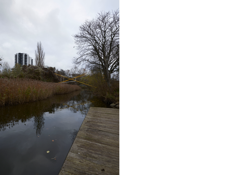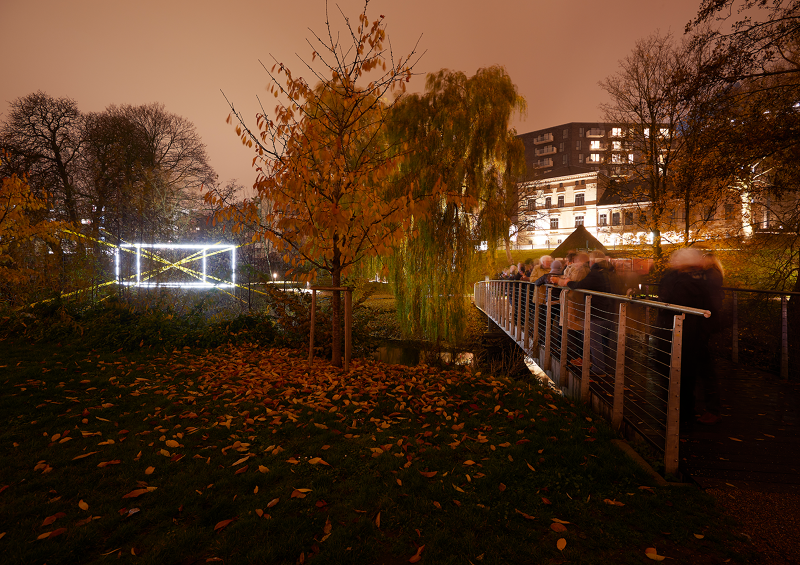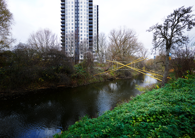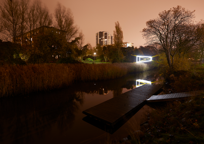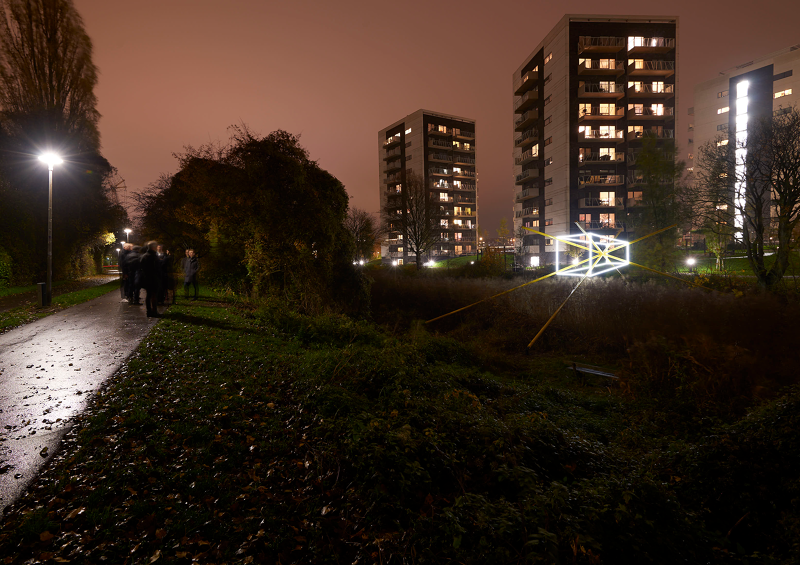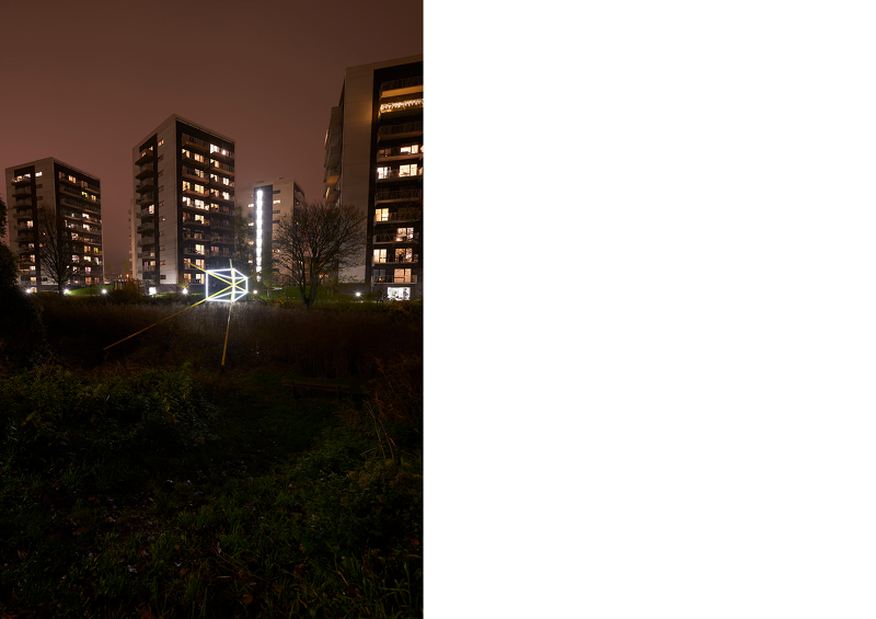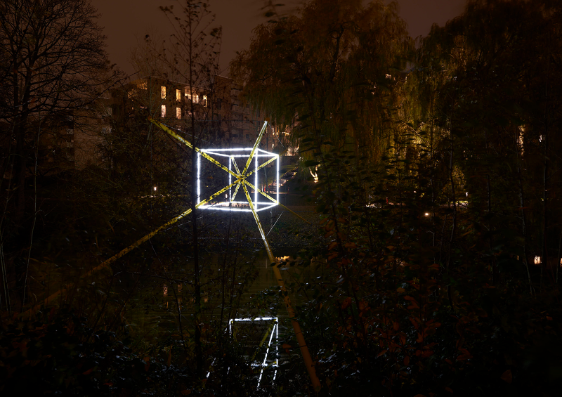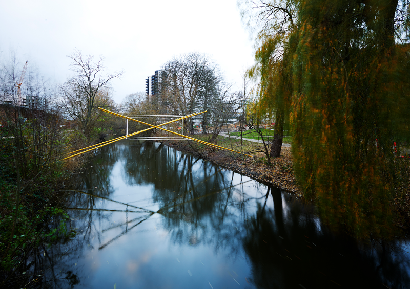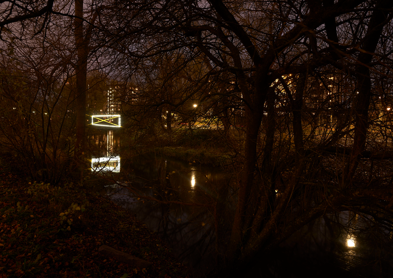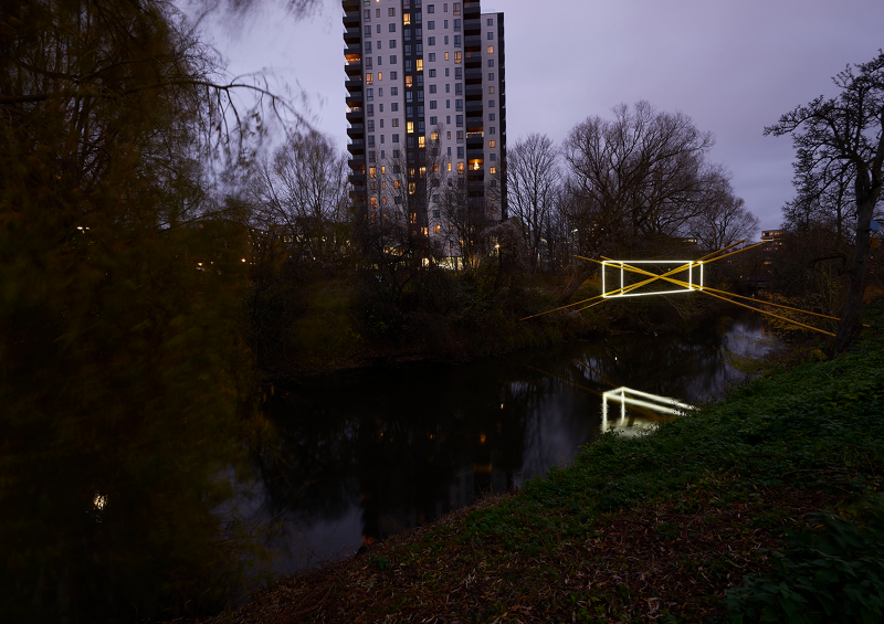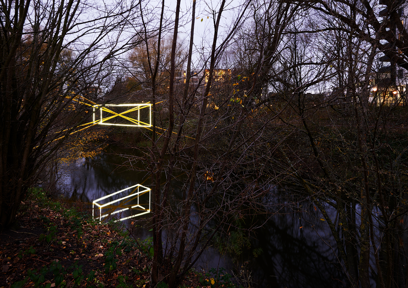 As a series of three sculptural propositions spanning the river, seen from each of the bridges the structures of light are perfectly intact, the unique perspective point revealing an almost impossible geometry floating between the trees, doubled by its reflection in the water below. As you walk across each bridge, along the path, the lines diverge, the symmetry lost, the form spins and distorts, challenging you to unpick its uncanny geometry from the growing and flowing city scape it inhabits.