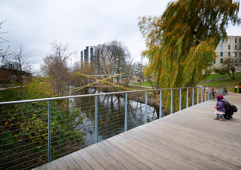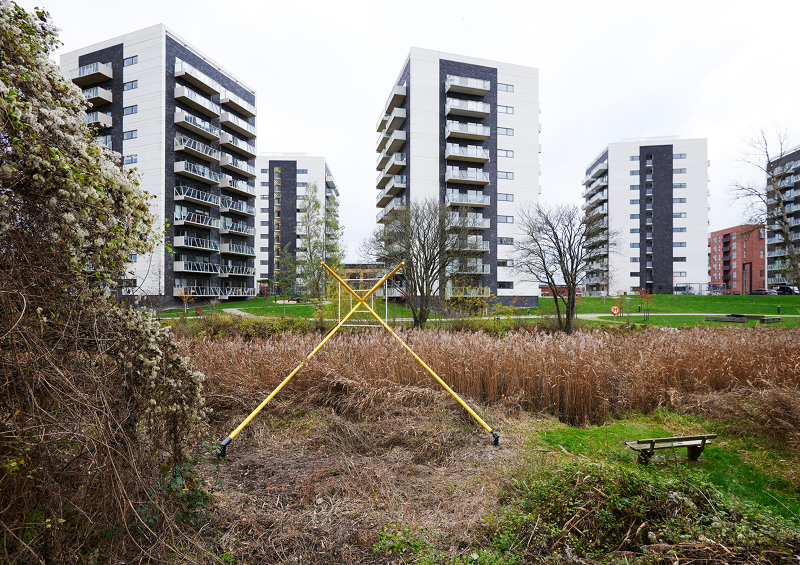 Origin uses the cube to simultaneously create a frame for nature, a looking point for the natural, while its firm lines echo the urban space just beyond its boundaries. The work seeks to create a fictional third space, an impossible intersection of city and nature, the two layered perfectly upon each other existing as cuts in reality. Floating in this third space above the water, Origin invites commuters and passers-by to reflect on their own spatial position, the body as a kinetic element linking city to nature. This relates directly to Aarhus, and how the city itself quite visibly floats between sea, sky and landscape.