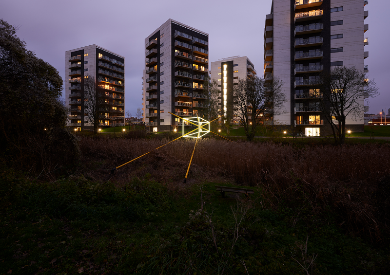 Origin seeks to reflect the multi-faceted nature of the unique site it occupies. The urban rural is incredibly prevalent in this collision of nature and city along the banks of the river, flanked by new architectural developments. By placing a series of three sculptures at intervals along the river, the work becomes a progression, the movement of bicycle riders and walkers echoing the movement within each cube. As the viewer encounters each form in turn, they begin to understand that it is in fact a single shape, spinning and moving through space. By combining the experience of encountering the work at separate locations across the river, with the durational sequence controlling the light on each, Origin becomes an artwork that is constantly changing and surprising even those who pass by it each day.