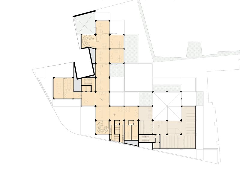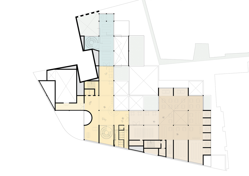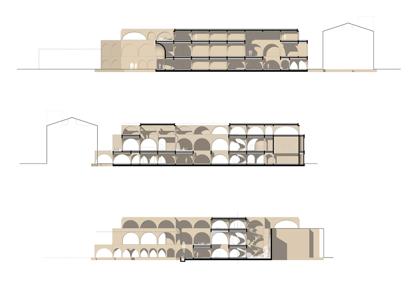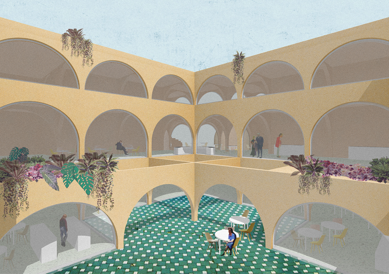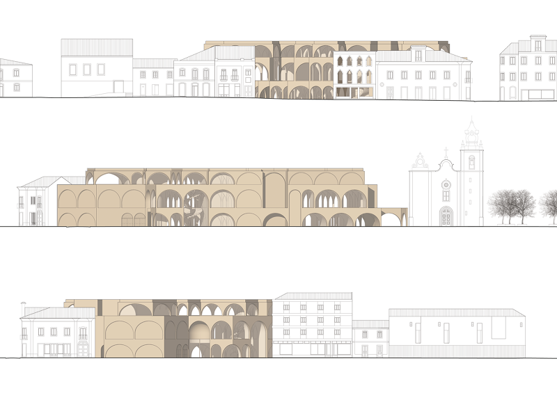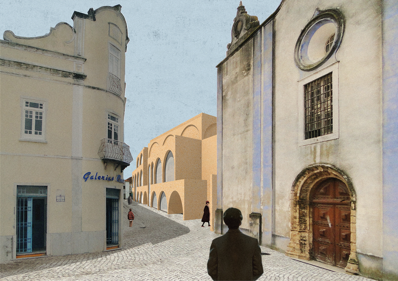 The two functions intertwine spatially, distributed between the interior spaces and the public space generated from the deconstruction of the grid: the exterior resonates with the segmentation of the interior through the arches of the coutyard. Pátio de Santiago’s generating principle is a central space that organizes the program along two perpendicular axes (within three floors) and one conceptual axis diagonal to the two previous axis that emphasises the relation between the generated public space with the planimetric and altimetric decomposition of the building allowing a visual connection towards the Castle. The materials of the building, clay-coloured concrete and limestone, integrate with the natural tones dominating the region (both the farming lands and the beaches of the West) and mimic the material of the historic buildings that were an influence to our proposal.