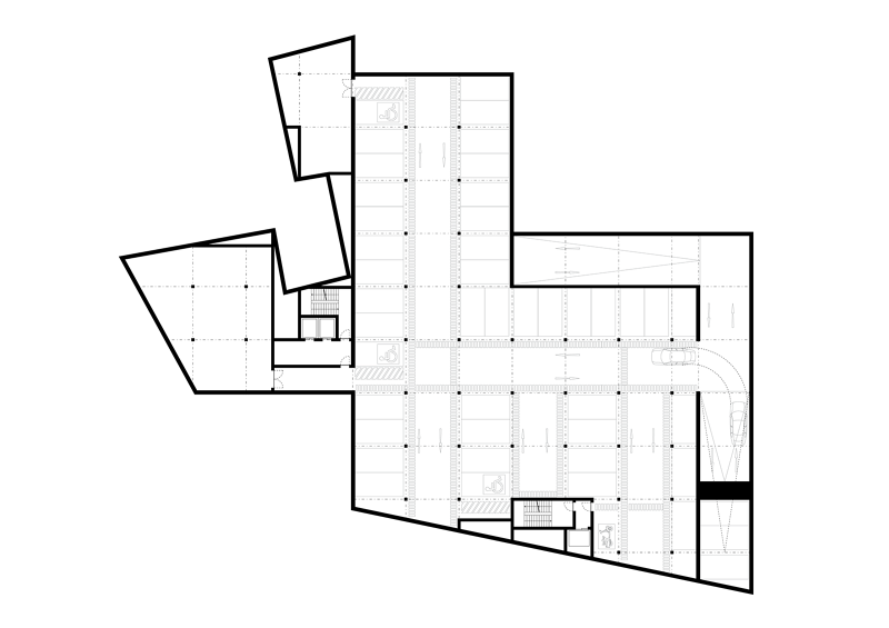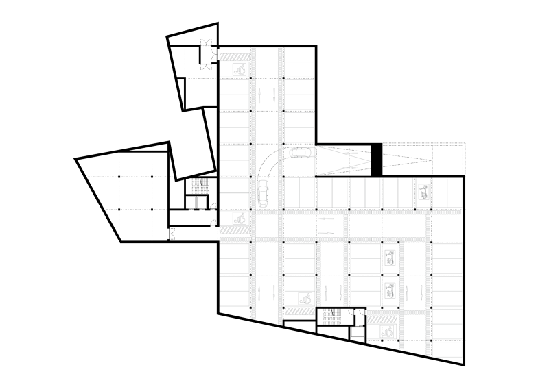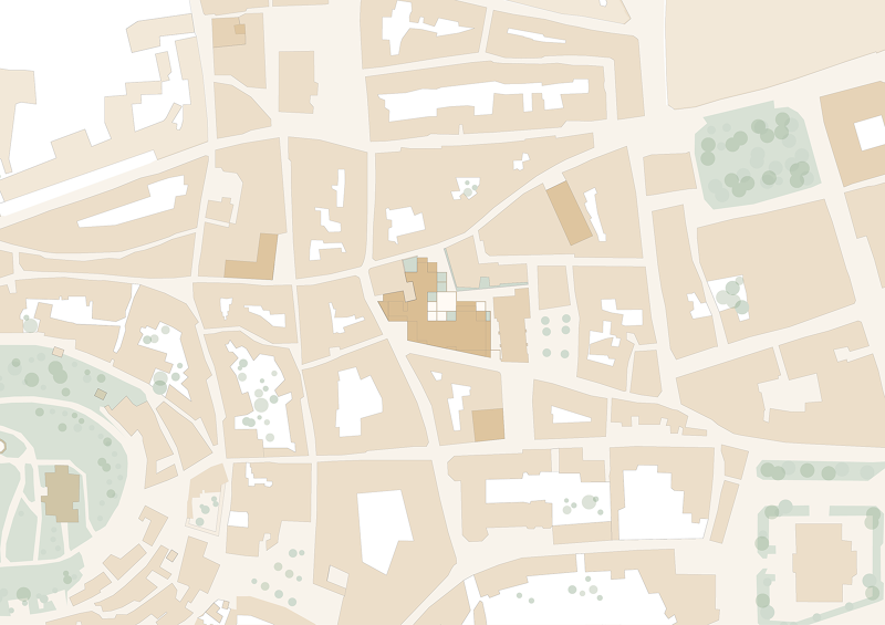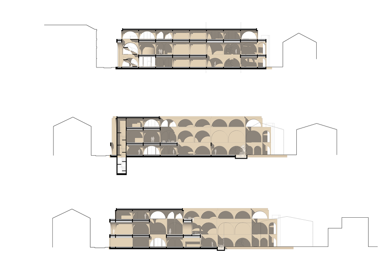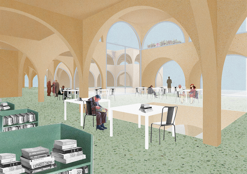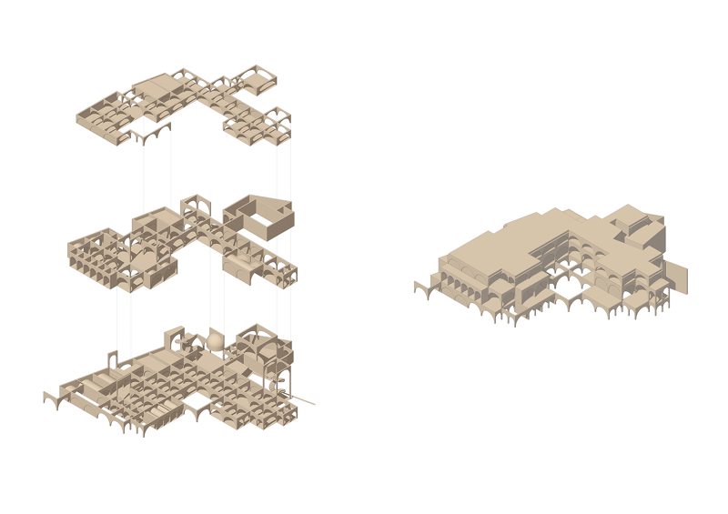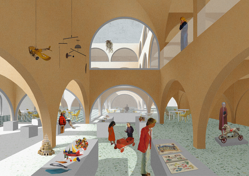 Our proposal for the Library and Toy Museum of Torres Vedras focuses on the dialogue with the historical heritage of the city. The functional distribution follows a square grid oriented north-south: this organisational device is a powerful response to the complexity of the surrounding urban space that developed organically for more than two centuries. Pátio de Santiago represents a patch in the urban fabric, a building that hosts two functions – the public library and the toy museum – and gives continuity to the adjoining urban facades. Starting from these limits the volume is gradually deconstructed and opens towards the south creating distance from the Igreja de Santiago. This geometry allows the building to be open in its interior, creating a patio generated by the absence of the constructive grid in space. The façade progressively retracts in multiple terraces creating a negative volume that expands vertically towards the Castle.