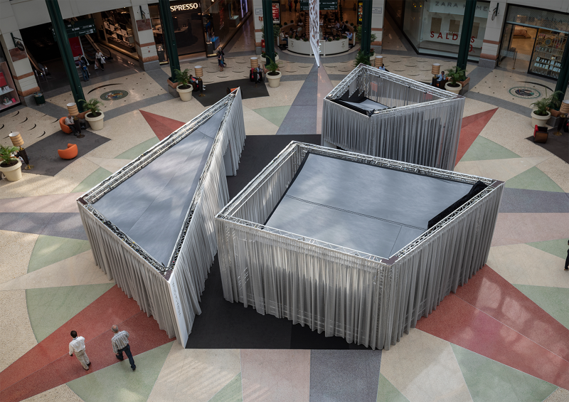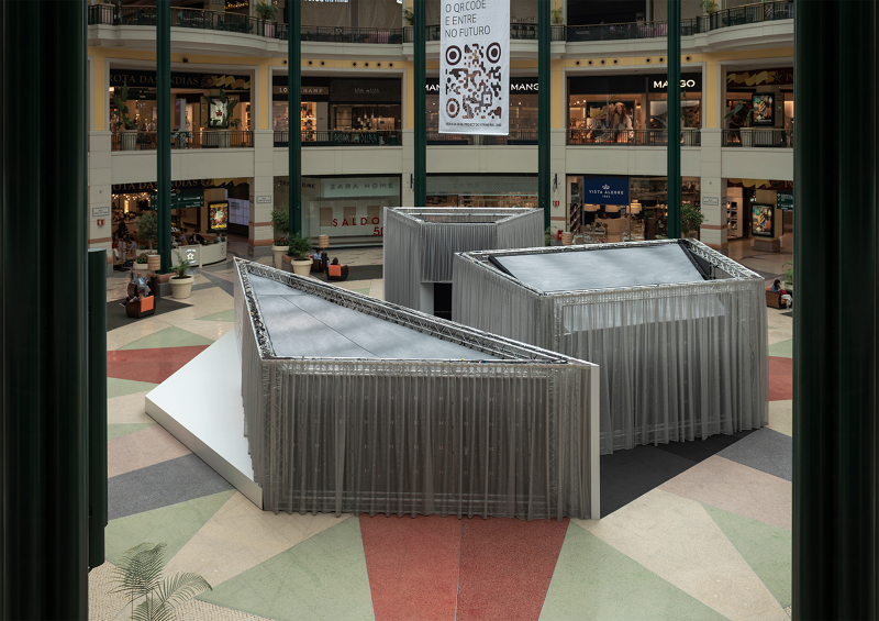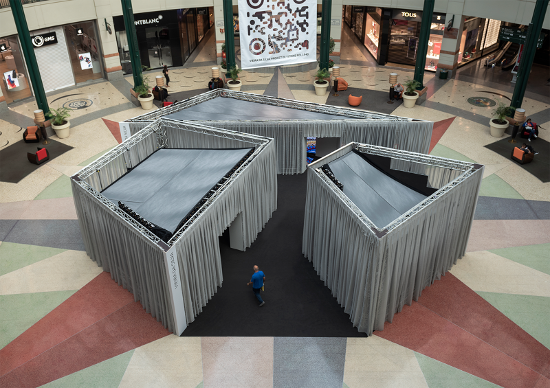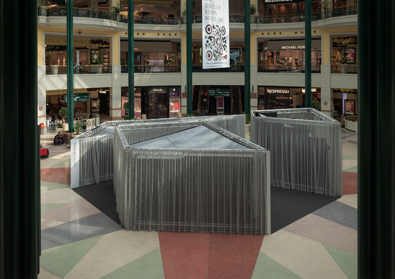 Planos de Fuga was installed in the central hall of Colombo – an ample and tall space with an imposing domed glass ceiling. The symmetrical nature of the atrium is accentuated by the windrose drawn in the terrazzo floor. Our proposal arises from this distinct geometry which suggests an octagon. This shape provides a simple solution for the setting out and it is then divided by the lines that join each vertex of the shape. From the grid that is created by this interpolation, we identified three shapes which were then raised into volumes of different heights.