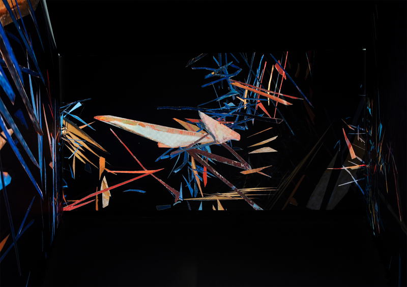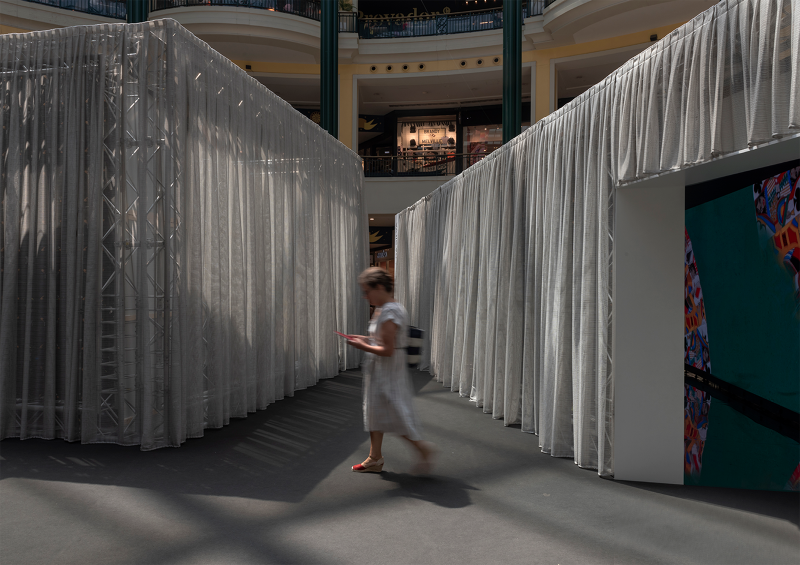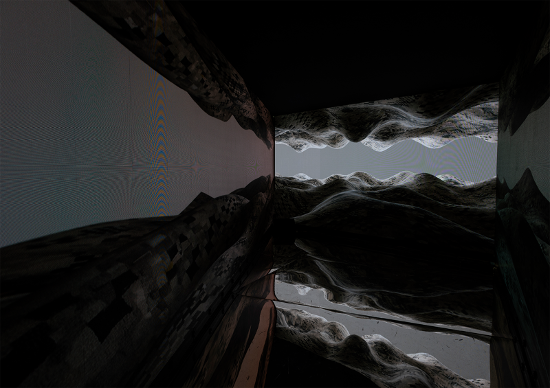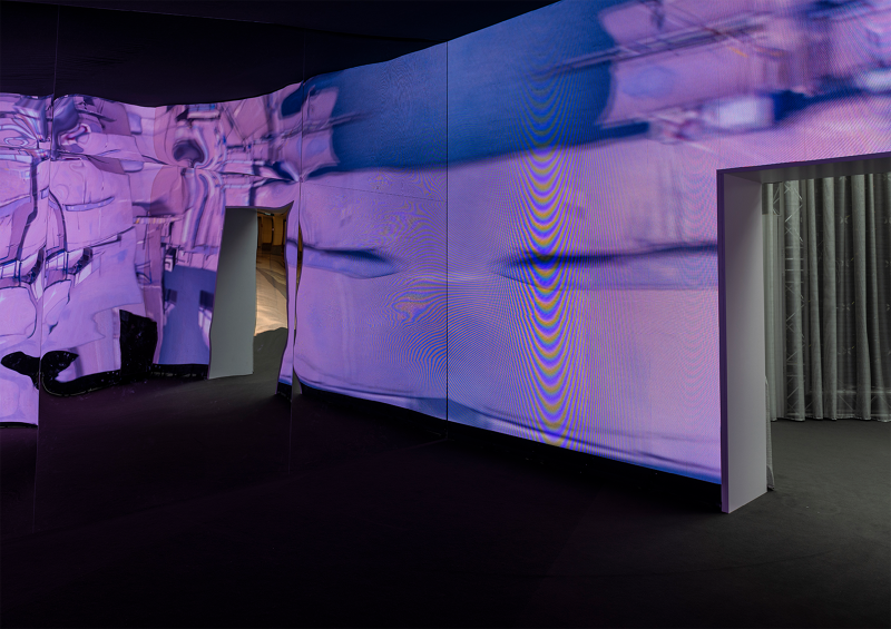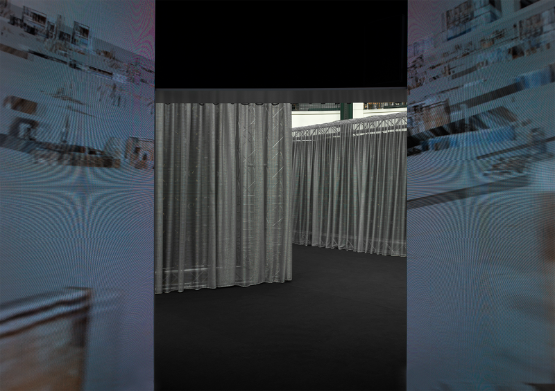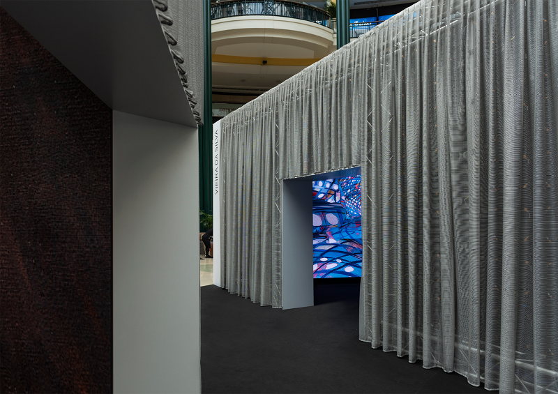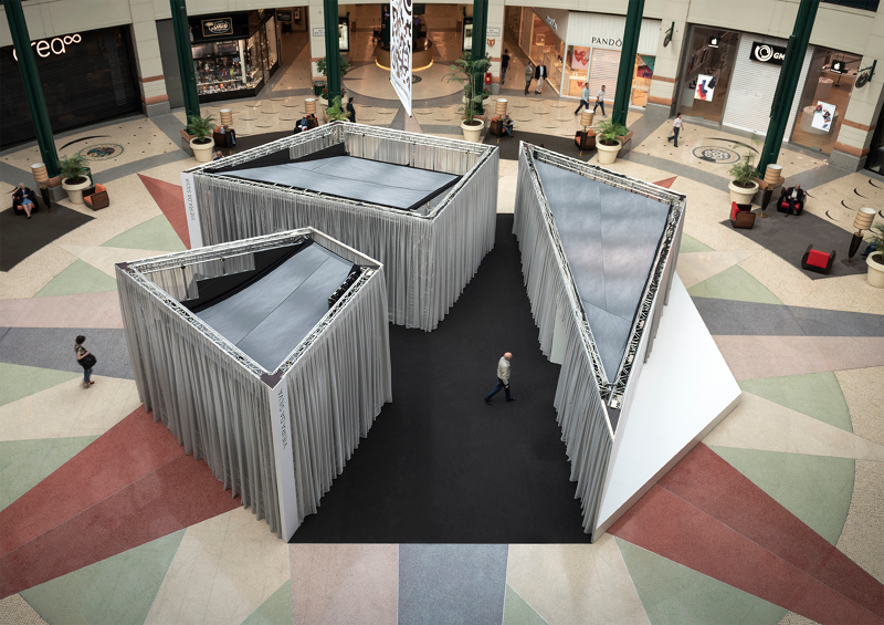 The outer geometry of the projection rooms and their relationships generate another space which itself plays with framing perspective views. This atrium centralises the entrances into the gallery rooms, simultaneously opening towards the main access passages to the main hall. The resulting diagonal spaces create cones of vision, which serve to frame the surrounding world. As such, the experience of visiting the immersive, digital exhibit is complemented with a different way of viewing reality. The three-dimensional composition of the volumes constructs visual relationships that vary around the pavilion, depending on the point of access which in itself is an abstraction of the urban landscapes of artist’s work.