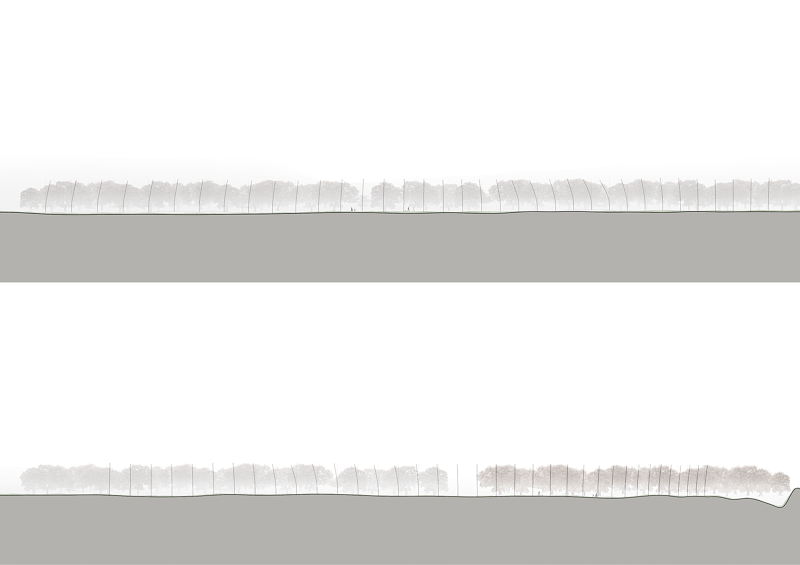 The placement of 36 slender poles in a gentle curve along the Kærlighedsstien creates an abstract gesture within the natural environment. The spirited presence of the work is achieved not with massive material effort but by pointing at the obvious, the quiet force of a bent environment, both shaped by the arched opening between the wooded areas as well as by the horizontal force of the wind moving across the landscape.