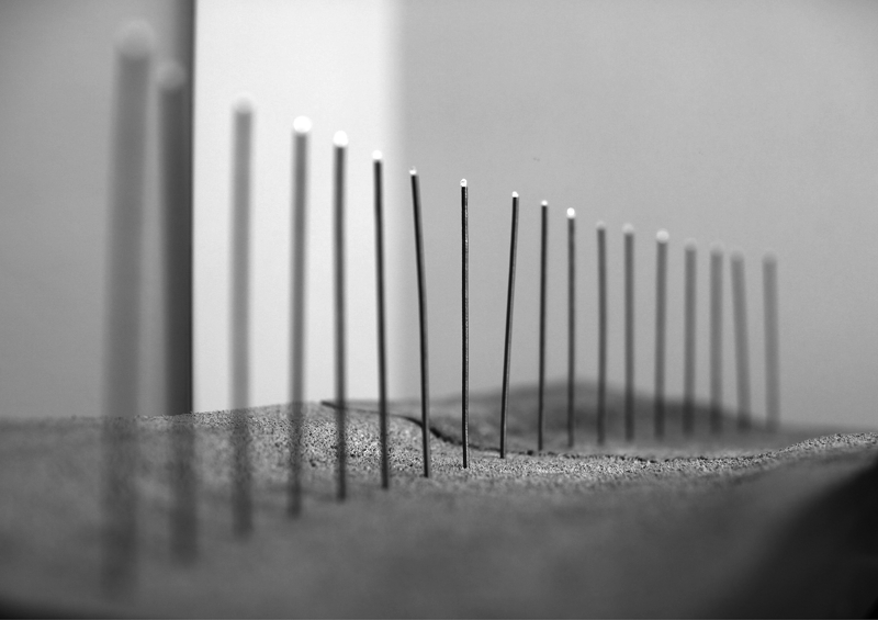 Each light is programmable and allows for an overlay of additional sequences spanning the array of poles. The natural horizon of the area is juxtaposed with an artificial horizon formed by waving lights on top of the poles. This double horizon introduces a perpetually changing polyphonic counterpoint upon and into the landscape. It is shaped by the interplay between the bending rods’ patterns, the programmed lights on top of the rods, the natural light, and the changes in the environment throughout Thorsø’s seasons.