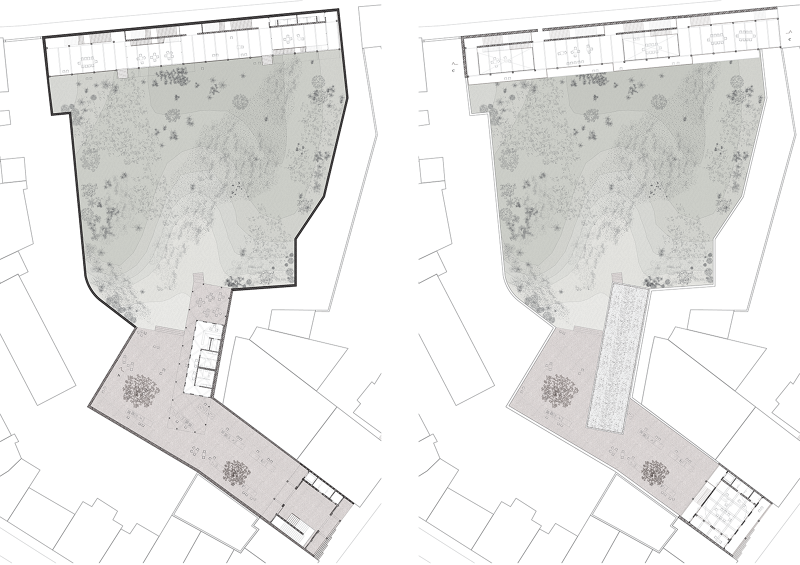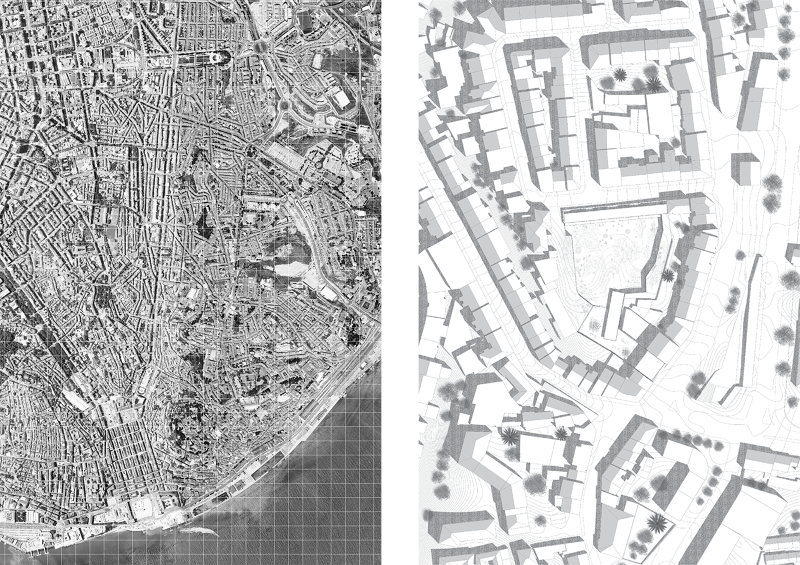 A found place in Lisbon, for years abandoned and solidified in a construction process, has lost its original meaning and has been forgotten and neglected in a sociocultural context. Unnoticed and protected by 12 metre high walls, an oasis of spontaneous vegetation emerged from its ground. The place is to be understood in the context of the ‘hortus conclusus’, enclosed and finite, landscape and architectural space. It shuts itself off from the outside world, the urban reality; it is a gap in the dense urban fabric; it is an oasis and a clearing giving a view to the sky above. The place is a mode of the ‘hortus conclusus’ by contemporary conditions whose old and new boundaries seek redefinition in the perception within the neighbourhood and as an architectural proposal.