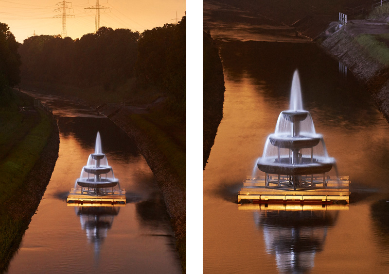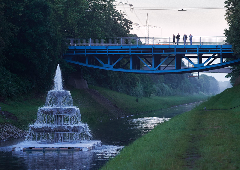Waste Water Fountain is composed of three octagonal basins mounted on a floating barge supplied by high volume pumps: these create an effect similar to that of cascading aerators, common in water treatment processes and capable of oxygenating the Emscher river while emphasizing the fact that an open waste water canal flows through an affluent part of Western Europe and is not hidden in the underground. By placing a four-meter high fountain in the middle of the Emscher river, we celebrate the river as social gut in the landscape where we all meet on equal terms. It points to the commonality of our waste and the fact that we are all subject to a universal process of corruption. At night the fountain lights up and during the 100 days of Emcherkunst the waste of high and low flows collectively through the fountain.