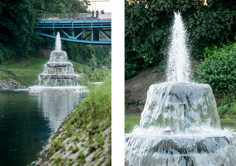 Waste Water Fountain was presented as part of Emscherkunst 2016. Emscherkunst is a triennial taking place for the third time between the cities of Holzwickede, Dortmund, Castrop-Rauxel, Recklinghausen and Herne: this 50 km long art trail deals with the conversion of the Emscher river as well as the urban and industrial transformation of the landscape in the Ruhr area. The Emscher river, once a small and lively river, was during the industrialization turned into an open canal for waste water, an open gut of the region.